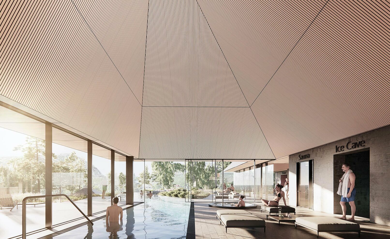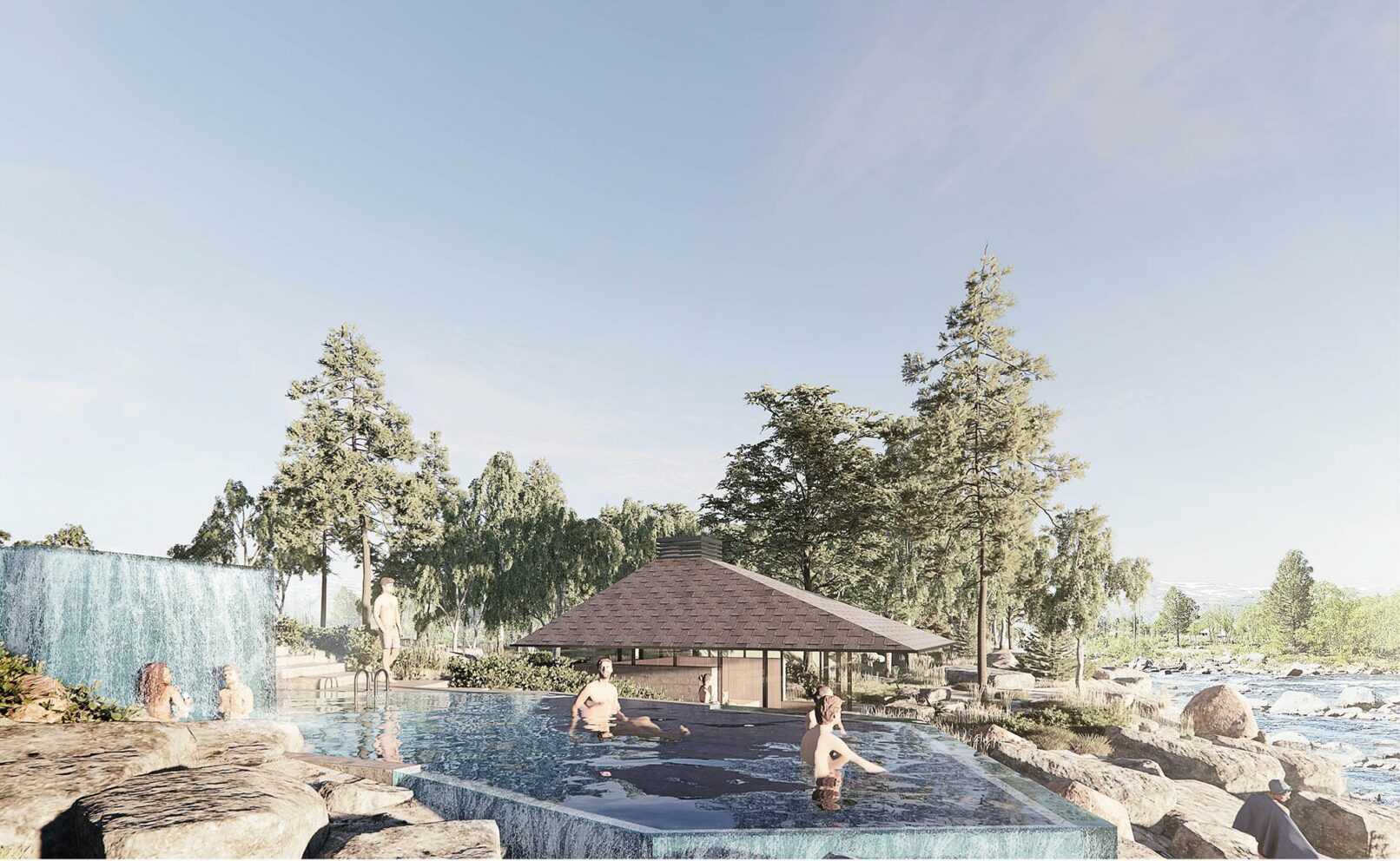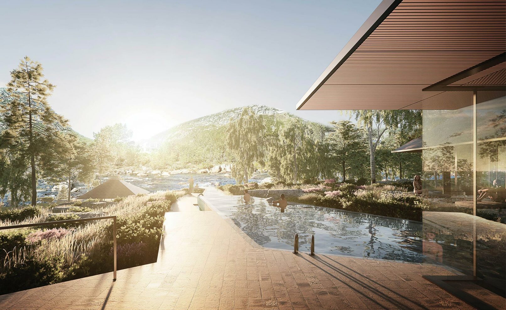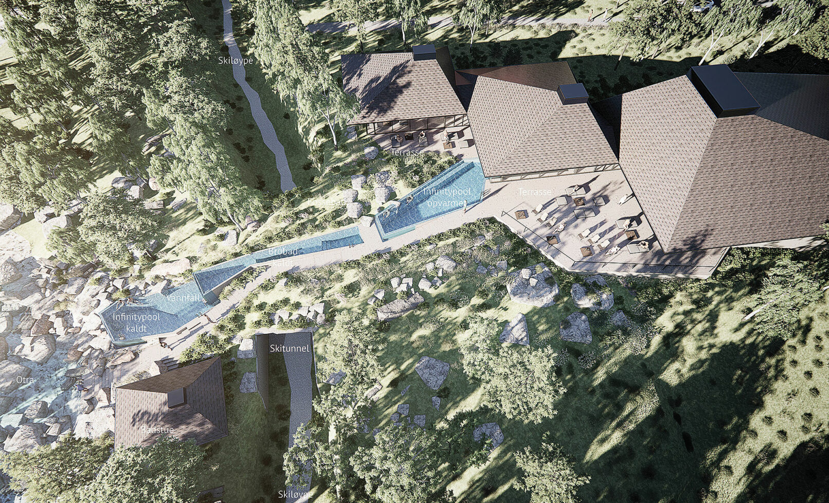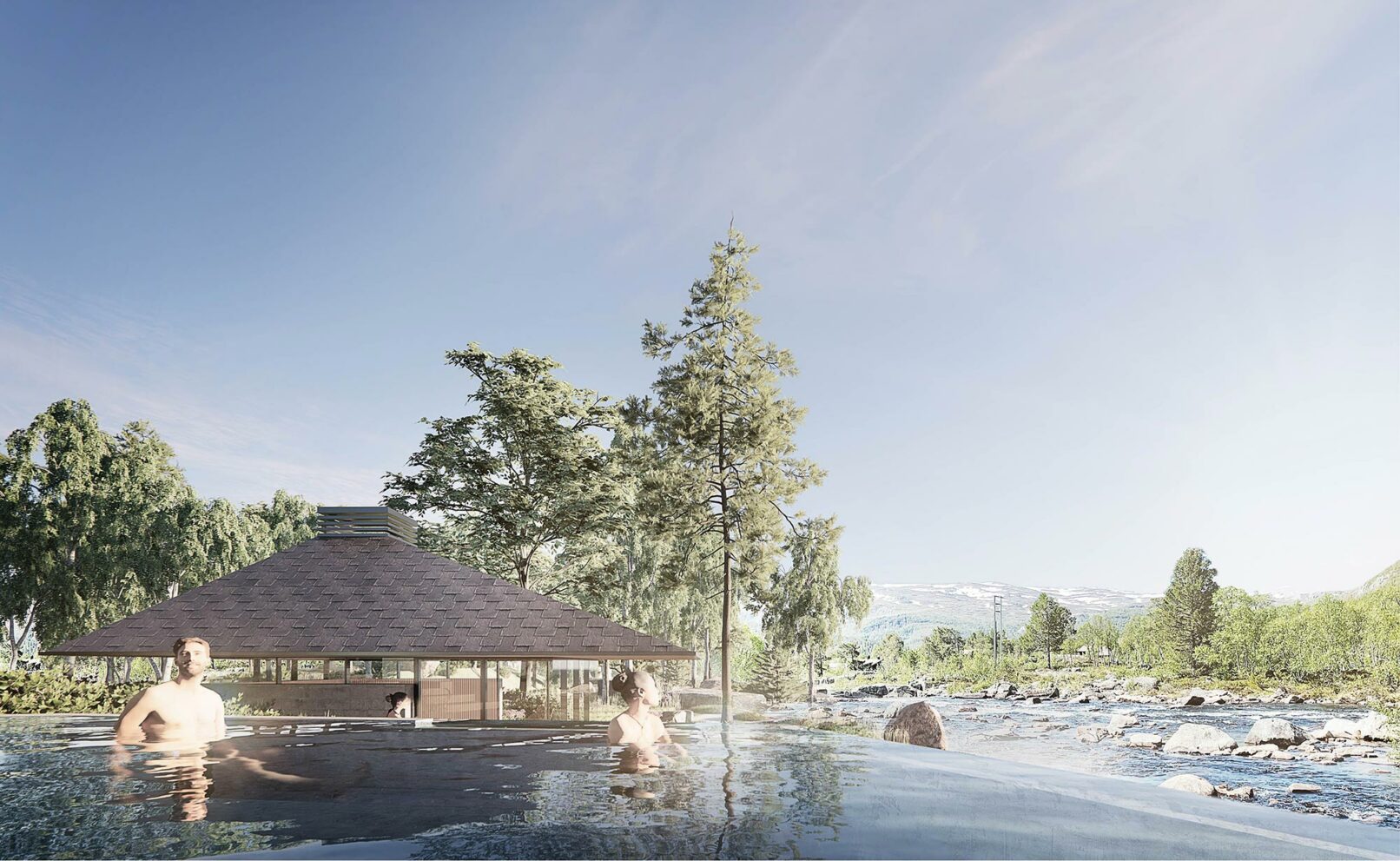 The bathing experience is formed as a poetic landscape of indoor and outdoor pools with small waterfalls, unique pools and a series of infinity pools stretching from entrance to the wild water of the Otra river. The design is a celebration of the many dams along the Otra, which provide renewable green energy and form a scenographic series of lakes along the Otra.