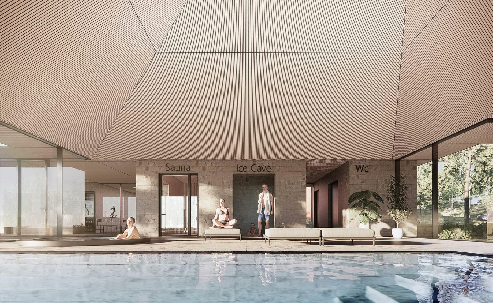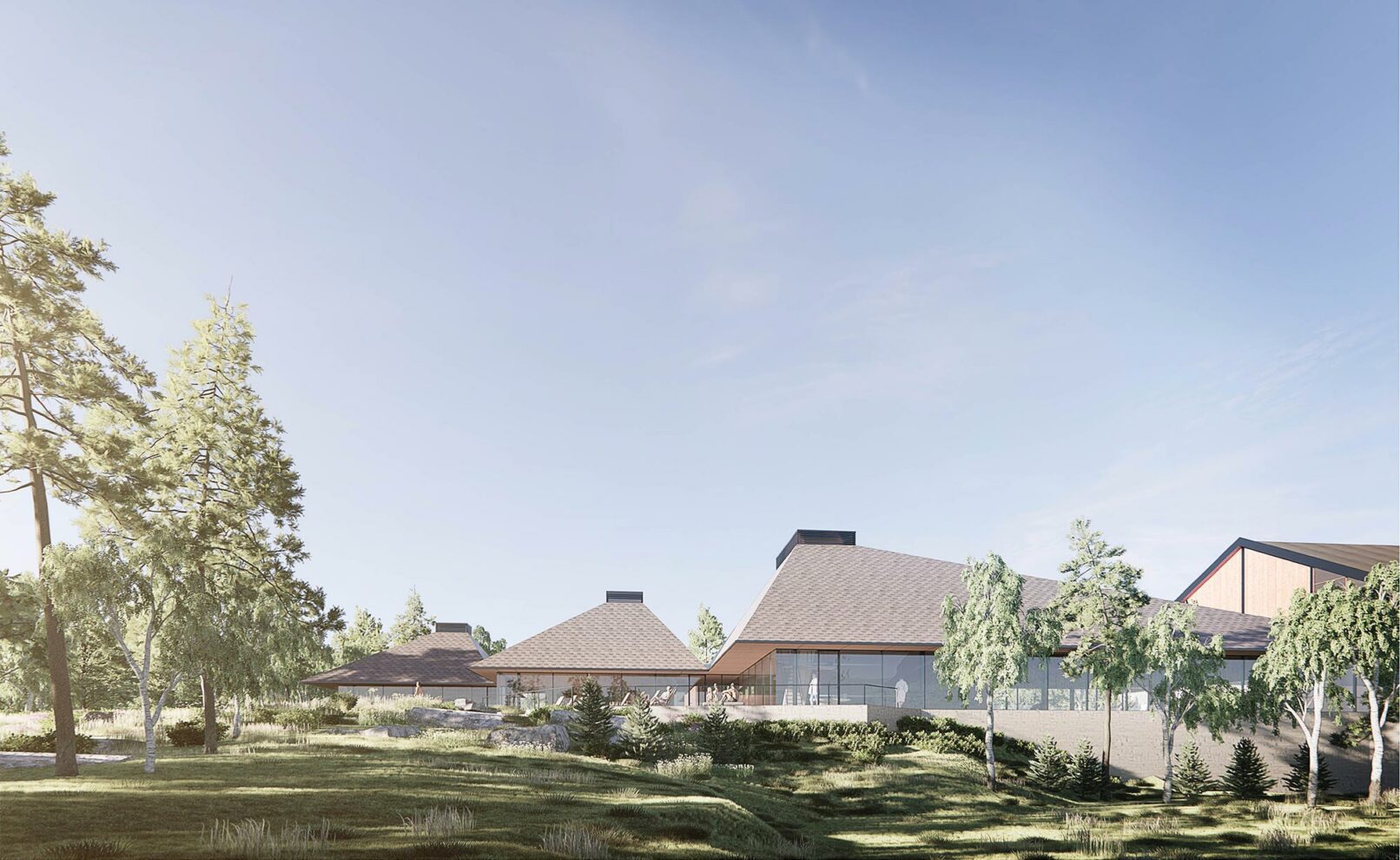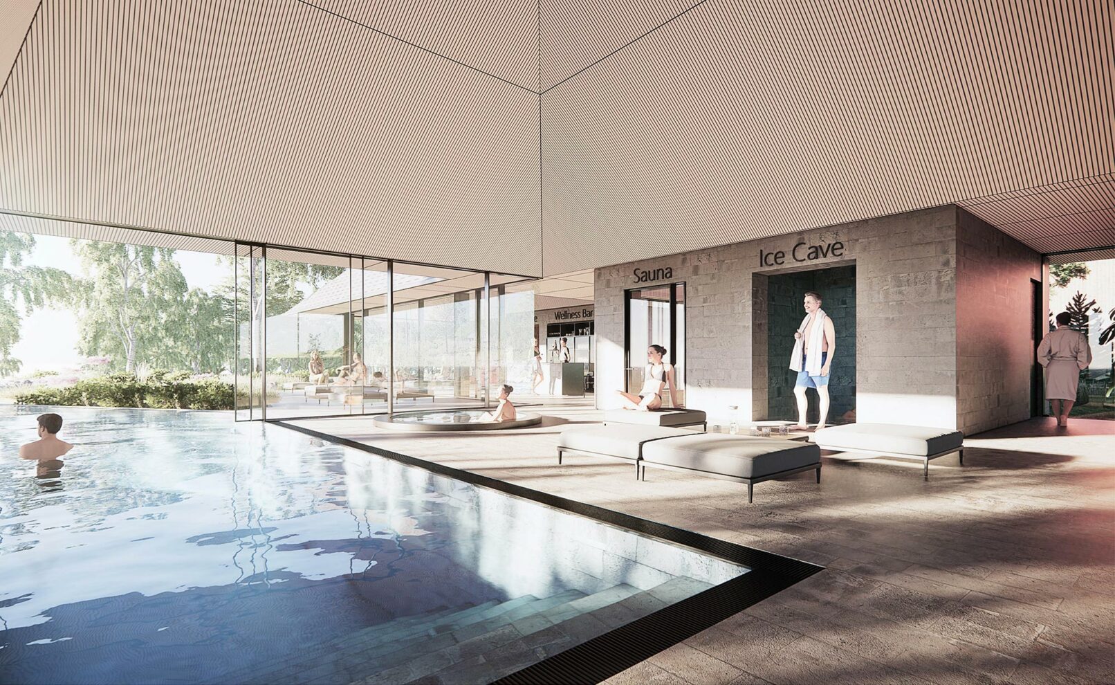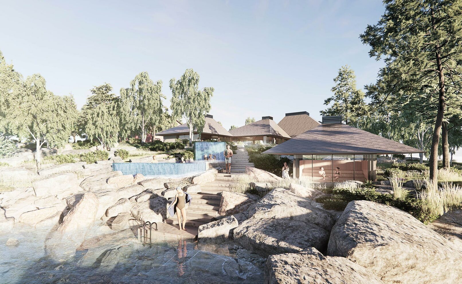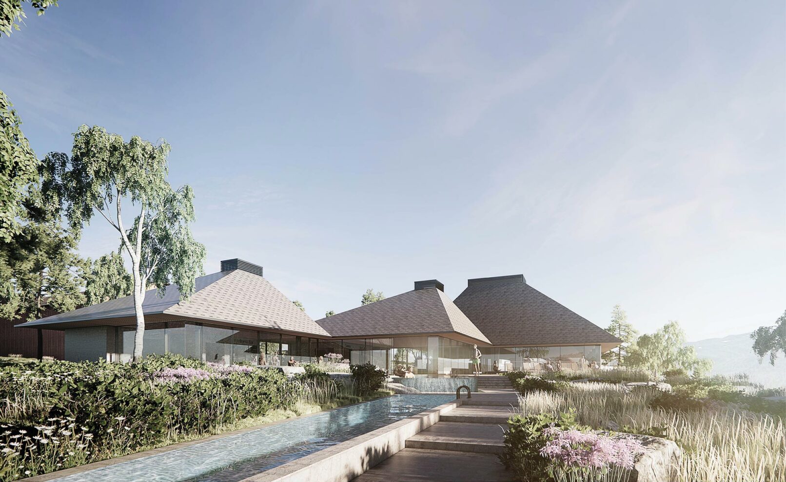 The bathing experience is formed as a poetic landscape of indoor and outdoor pools with small waterfalls, unique pools and a series of infinity pools stretching from entrance to the wild water of the Otra river. The design is a celebration of the many dams along the Otra, which provide renewable green energy and form a scenographic series of lakes along the Otra.
