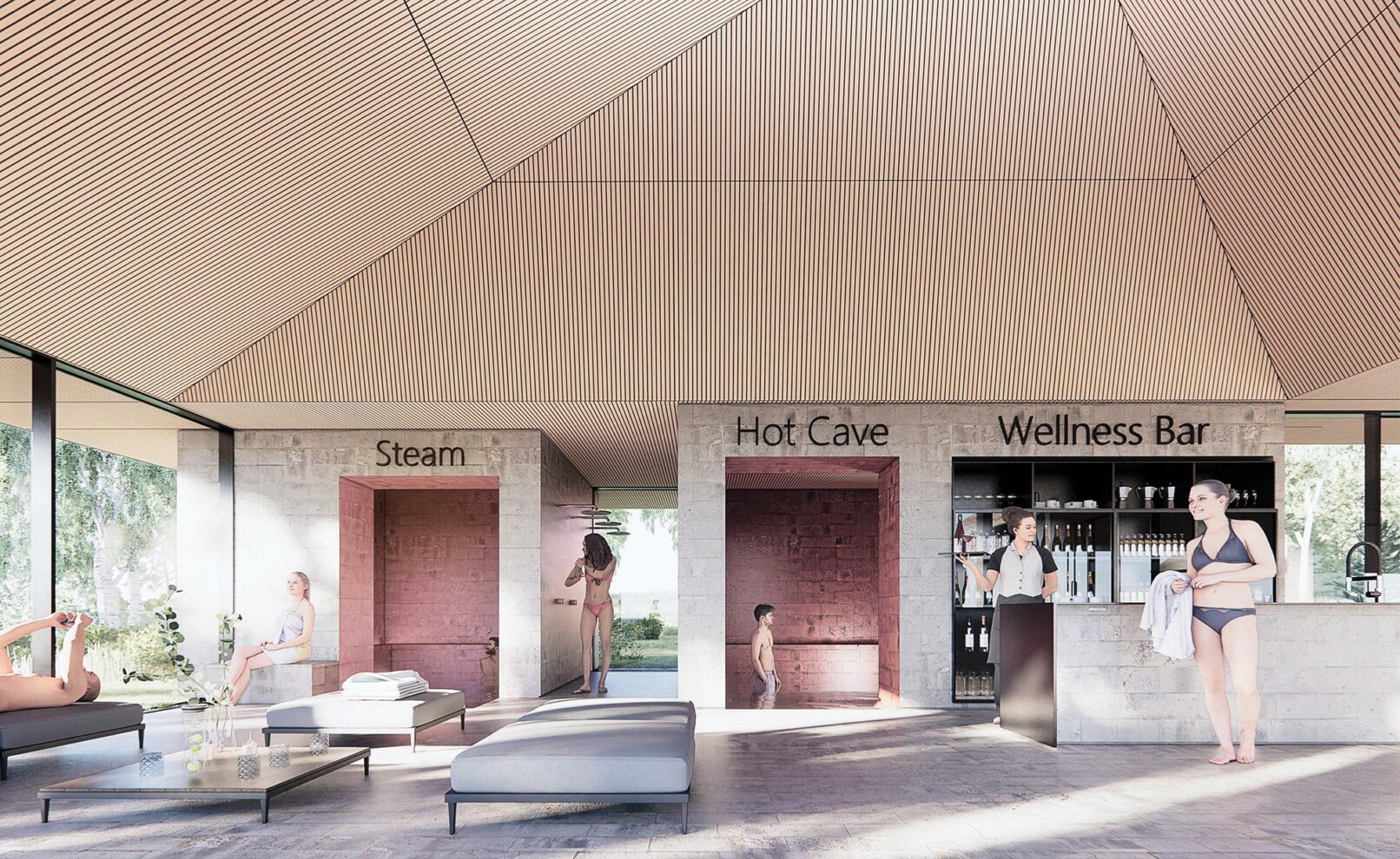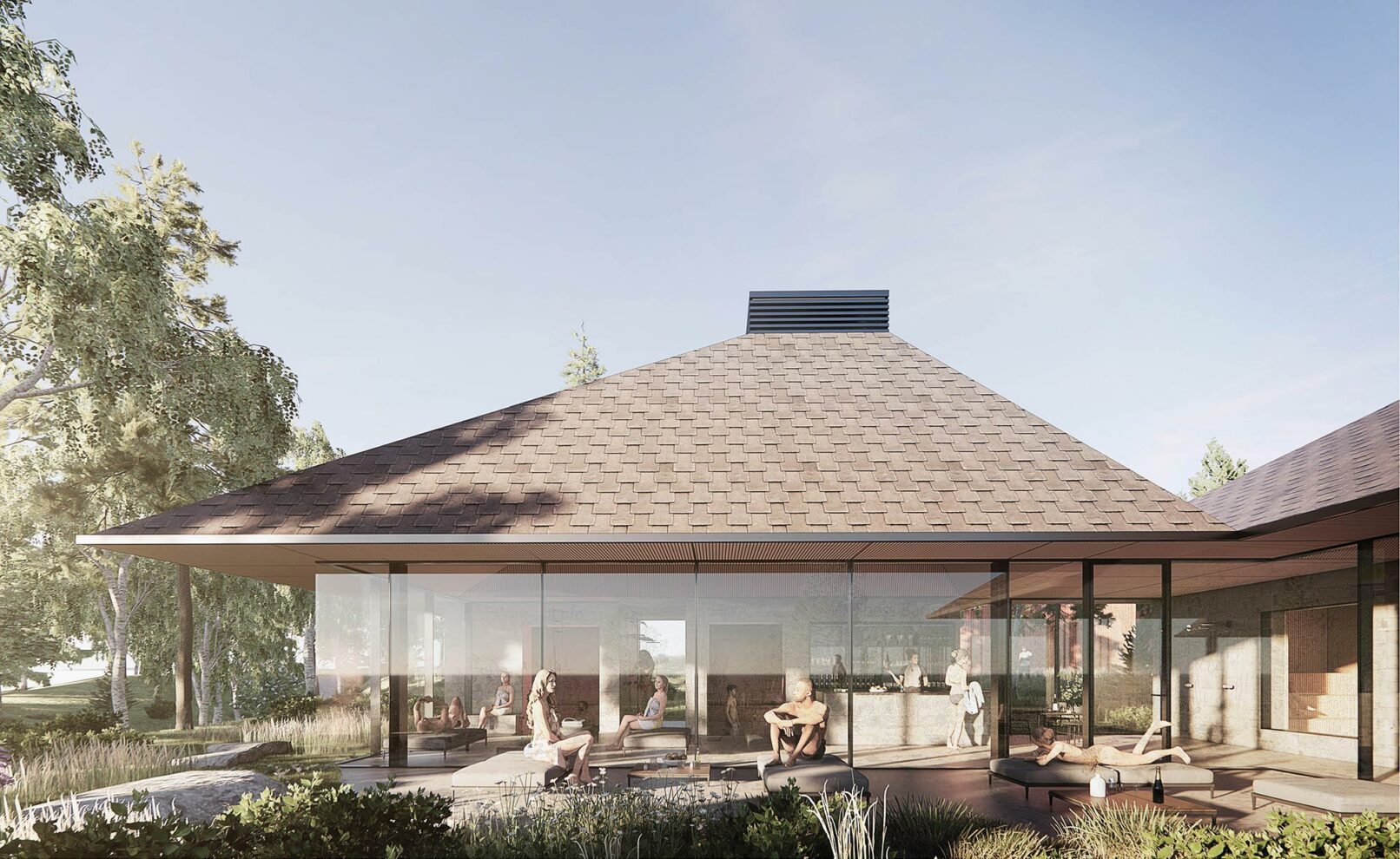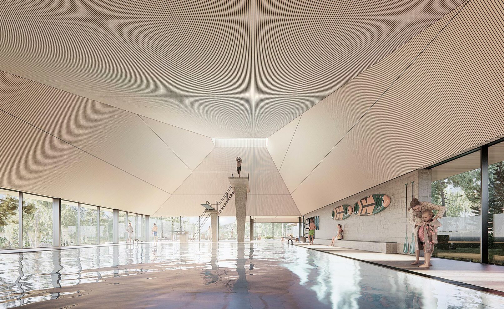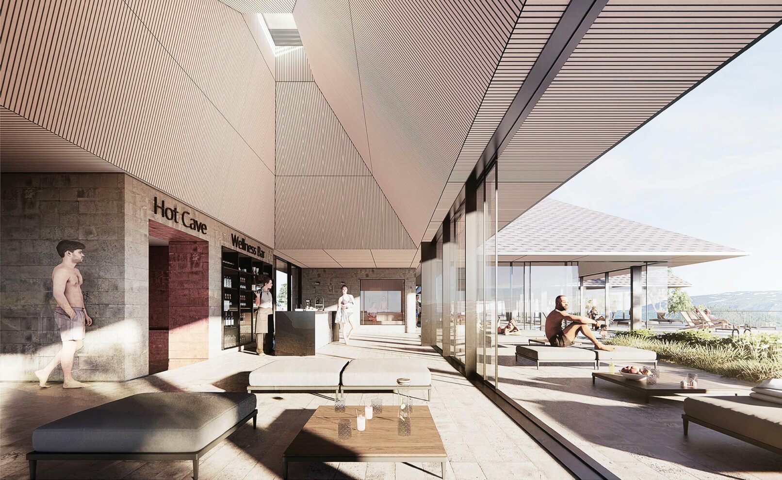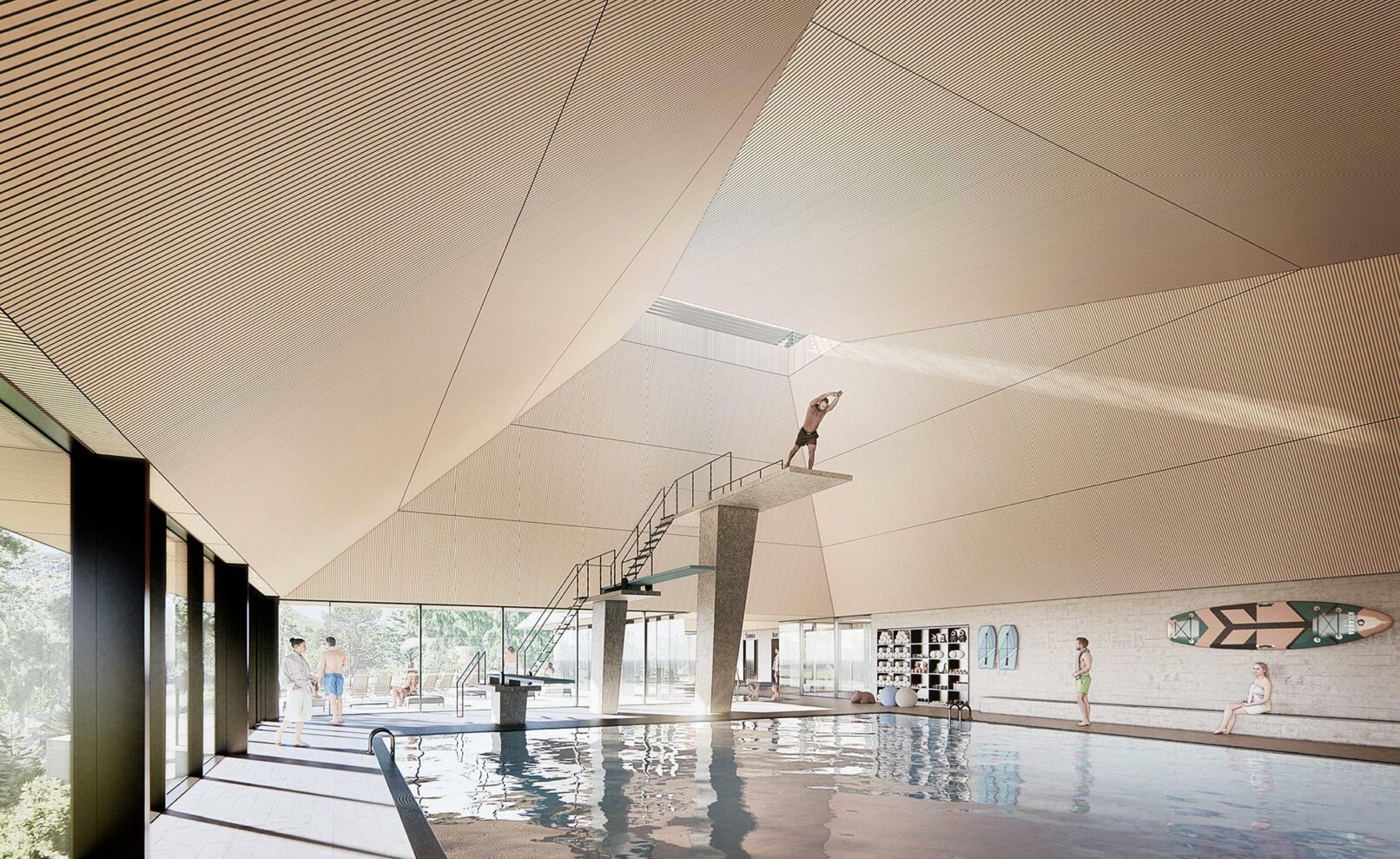 The bathing experience is formed as a poetic landscape of indoor and outdoor pools with small waterfalls, unique pools and a series of infinity pools stretching from entrance to the wild water of the Otra river. The design is a celebration of the many dams along the Otra, which provide renewable green energy and form a scenographic series of lakes along the Otra.