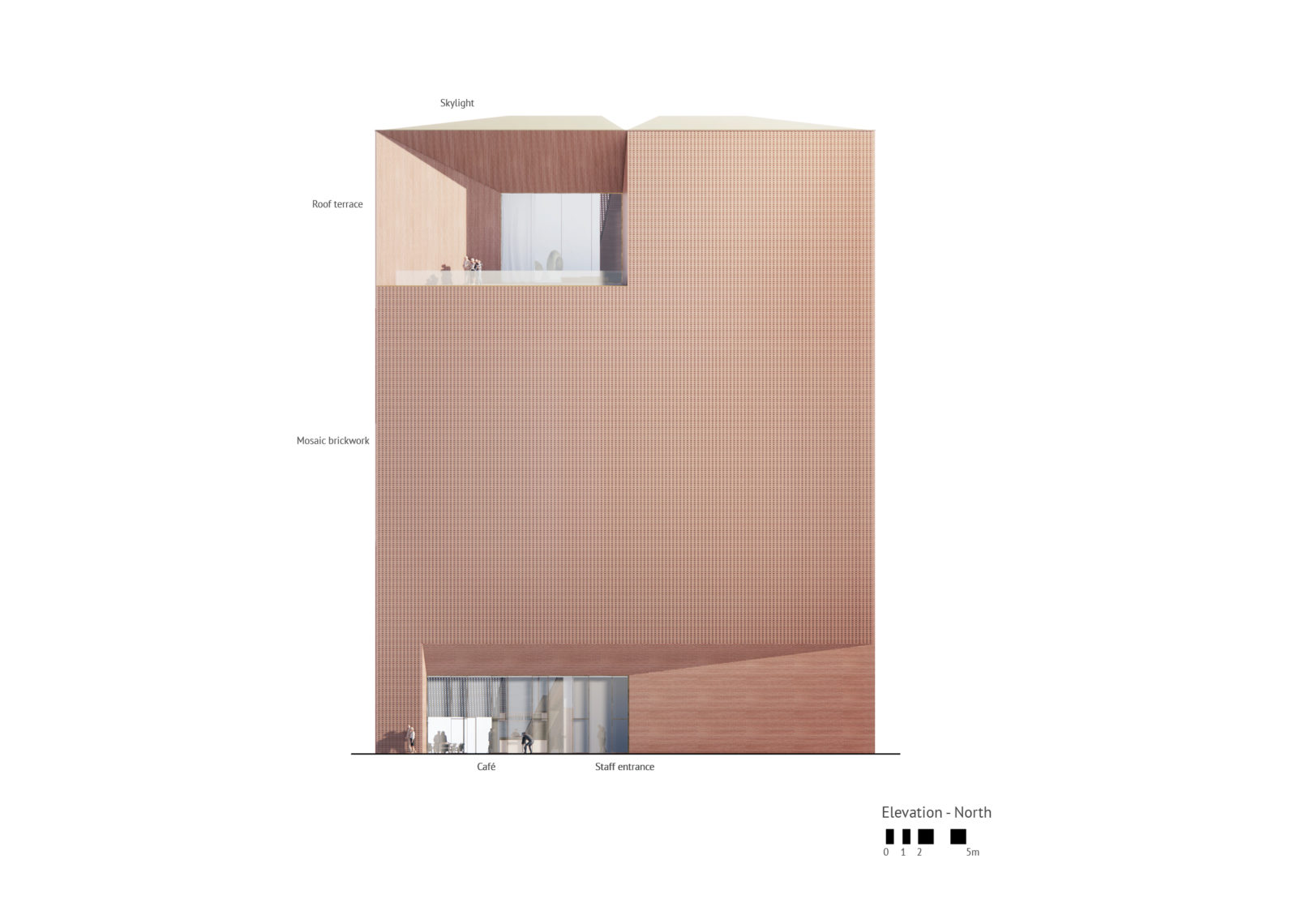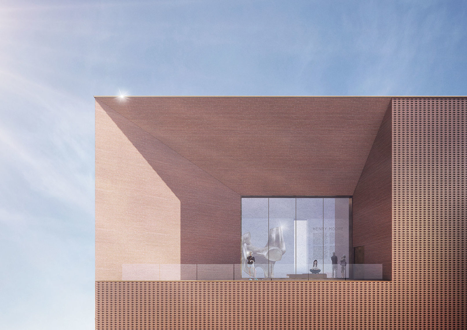 The new museum is adapted and shaped to the context and site by a cut in the cube emphasizing and framing the main entrance. Frames become a signature element creating views to the city, a roof terrace overlooks the surrounding landscape, and skylights with indirect daylight at the top galleries.