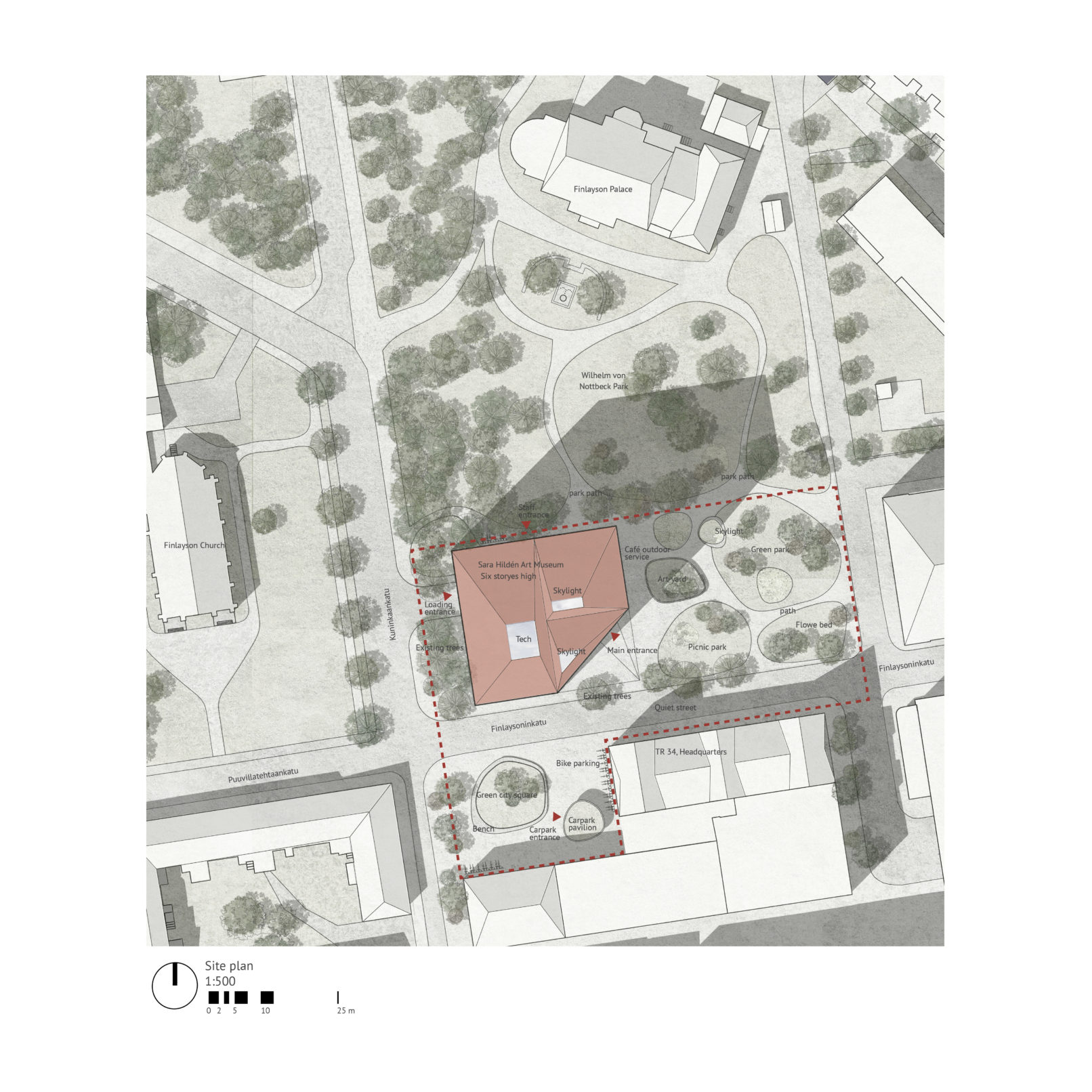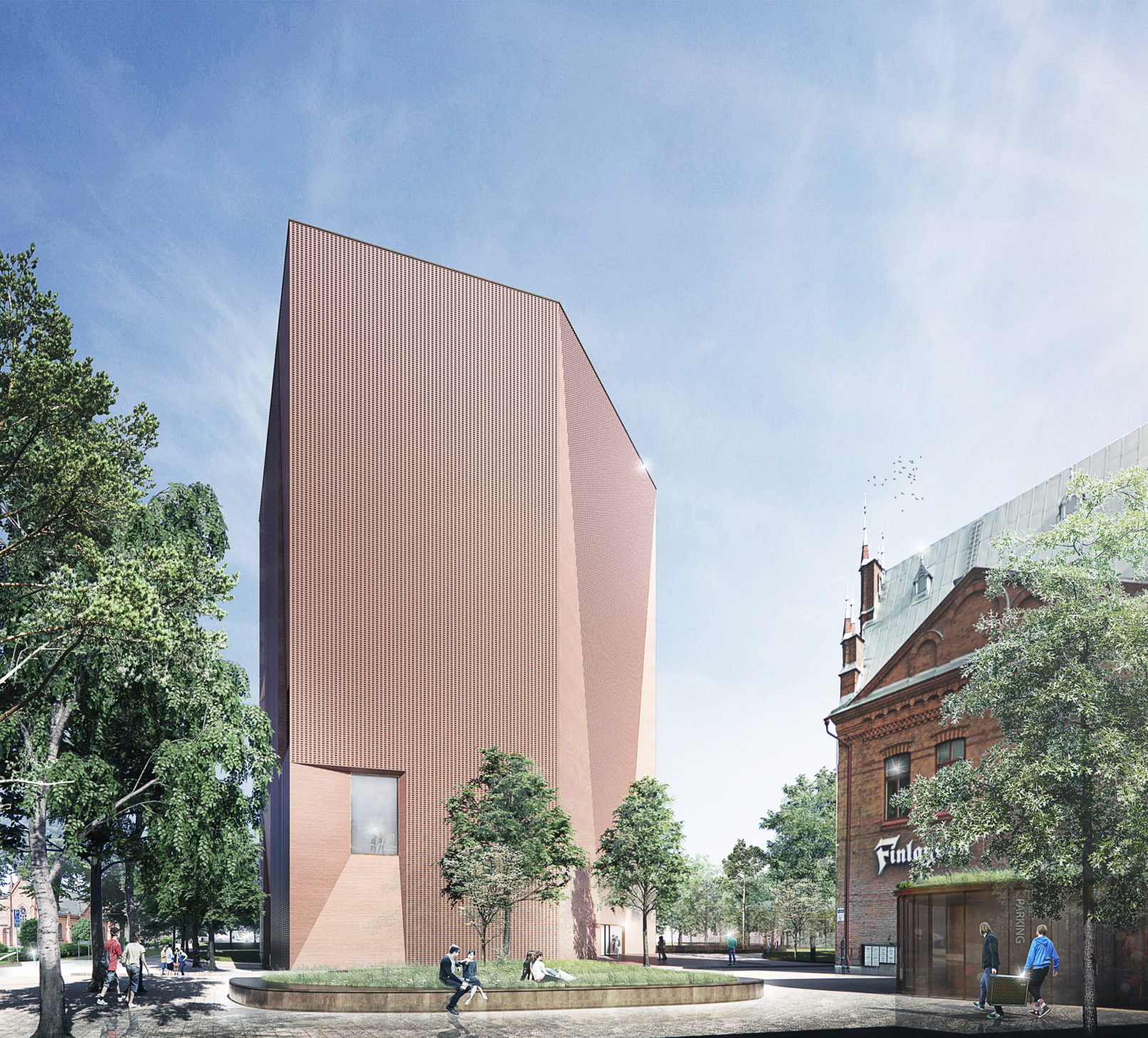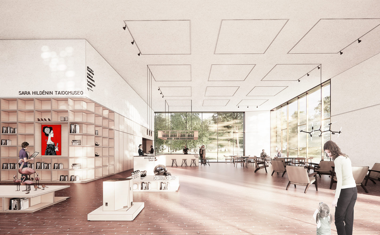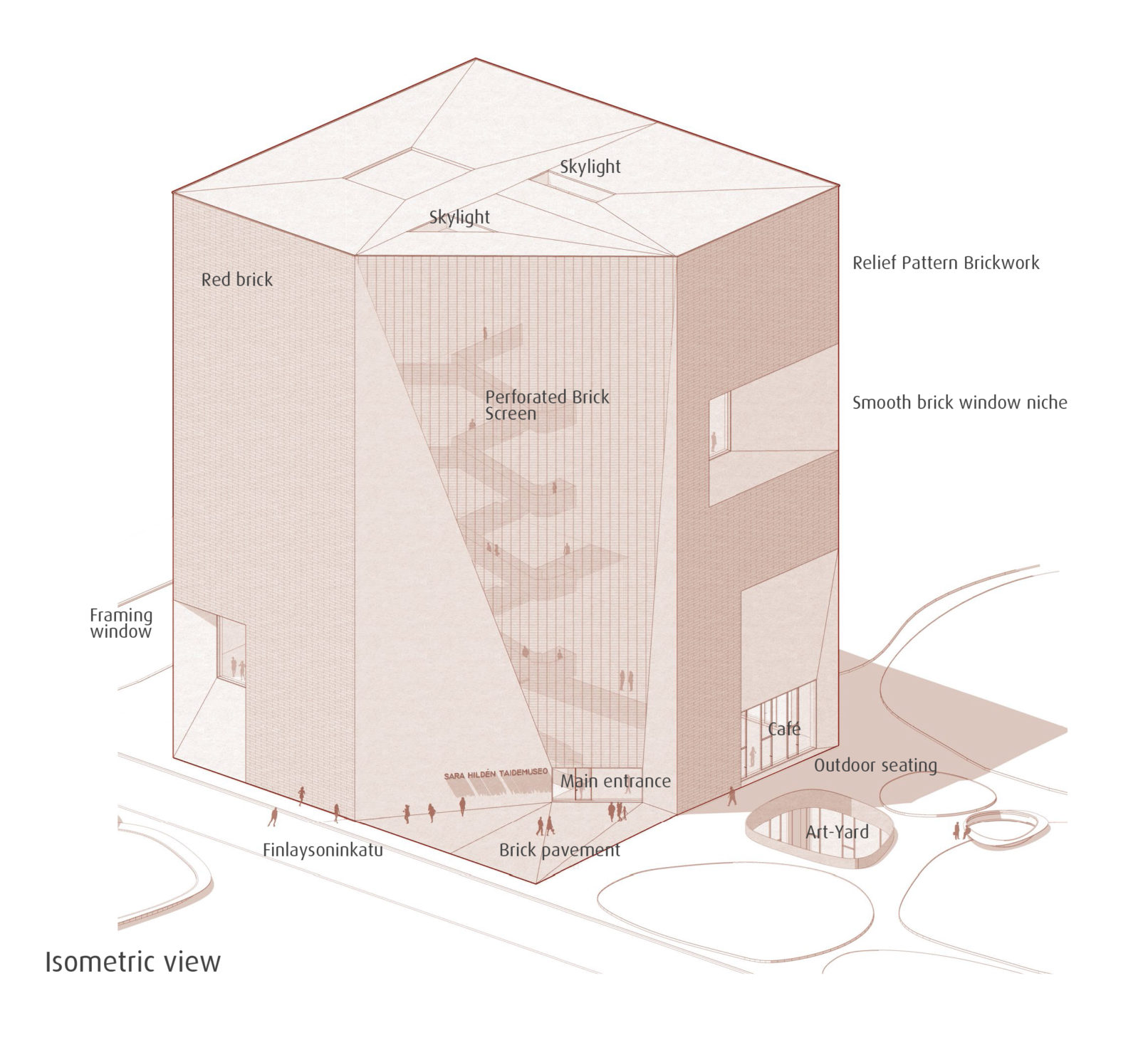 The Sara Hildén Art Museum is designed as a strong sculptural monolith for artwork with a minimal footprint to maximize sightlines and unite the green park, the industrial Finlayson Area and the city.