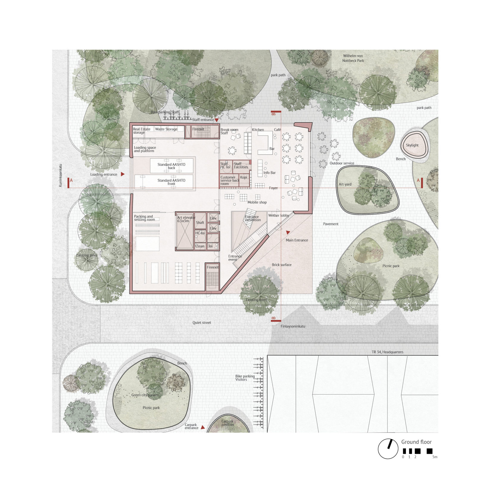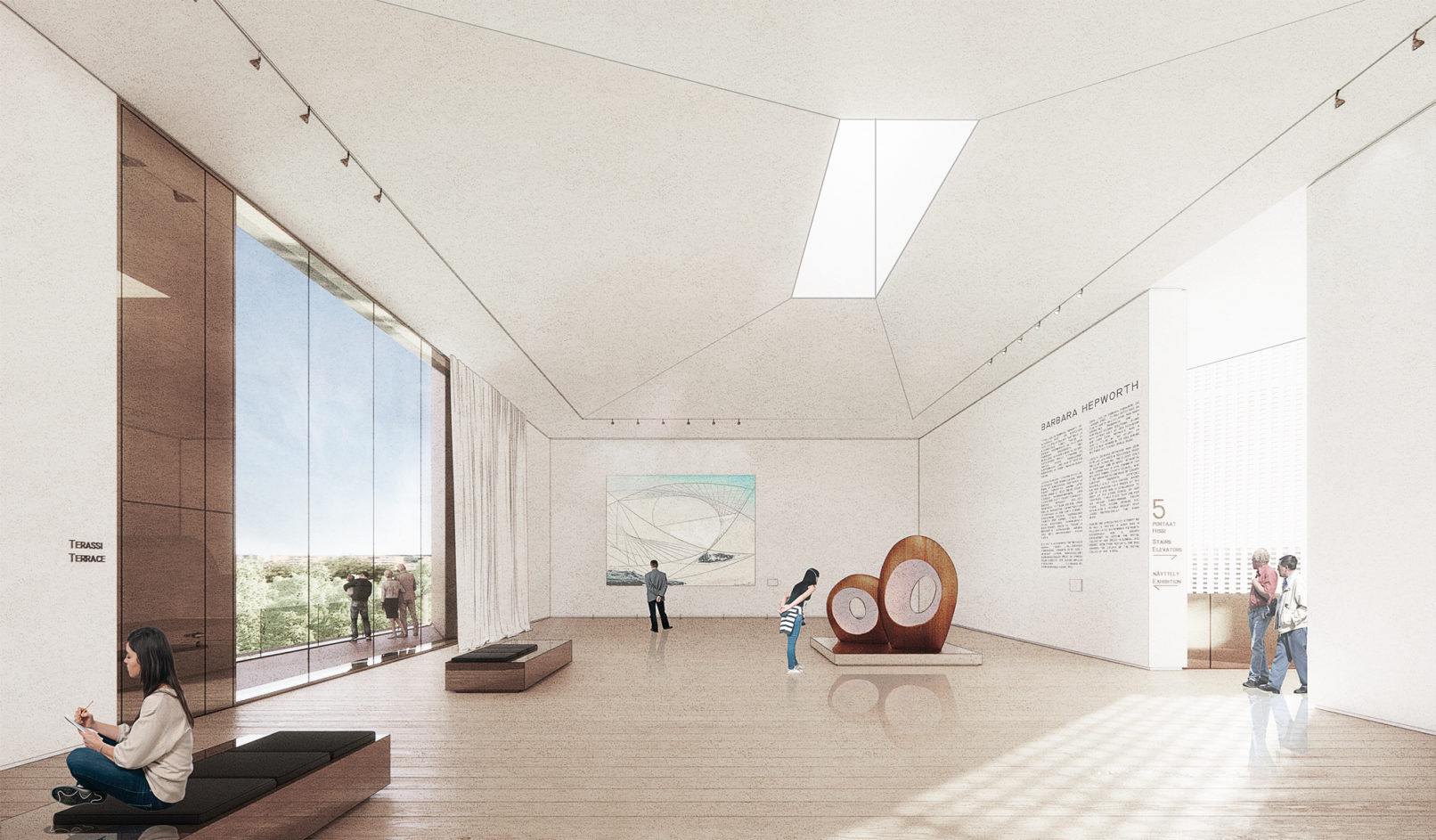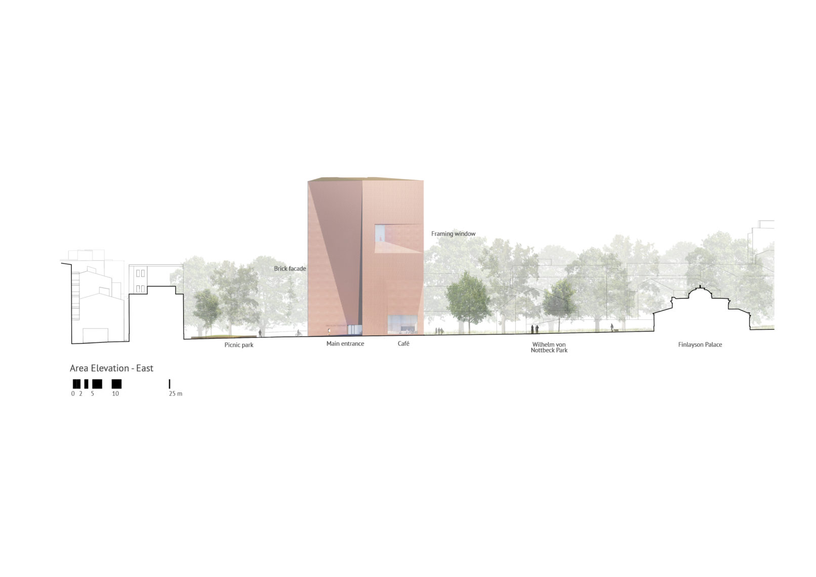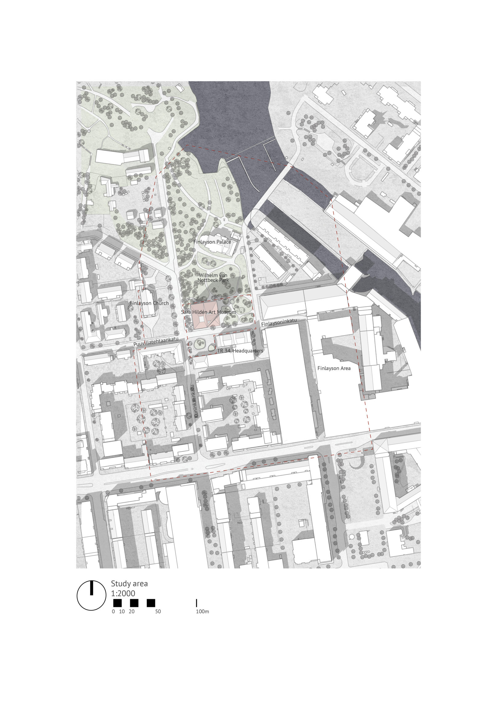 The Sara Hildén Art Museum is designed as a strong sculptural monolith for artwork with a minimal footprint to maximize sightlines and unite the green park, the industrial Finlayson Area and the city.
