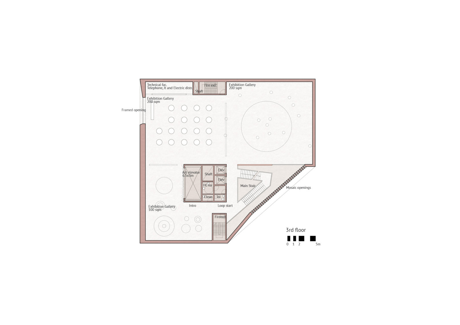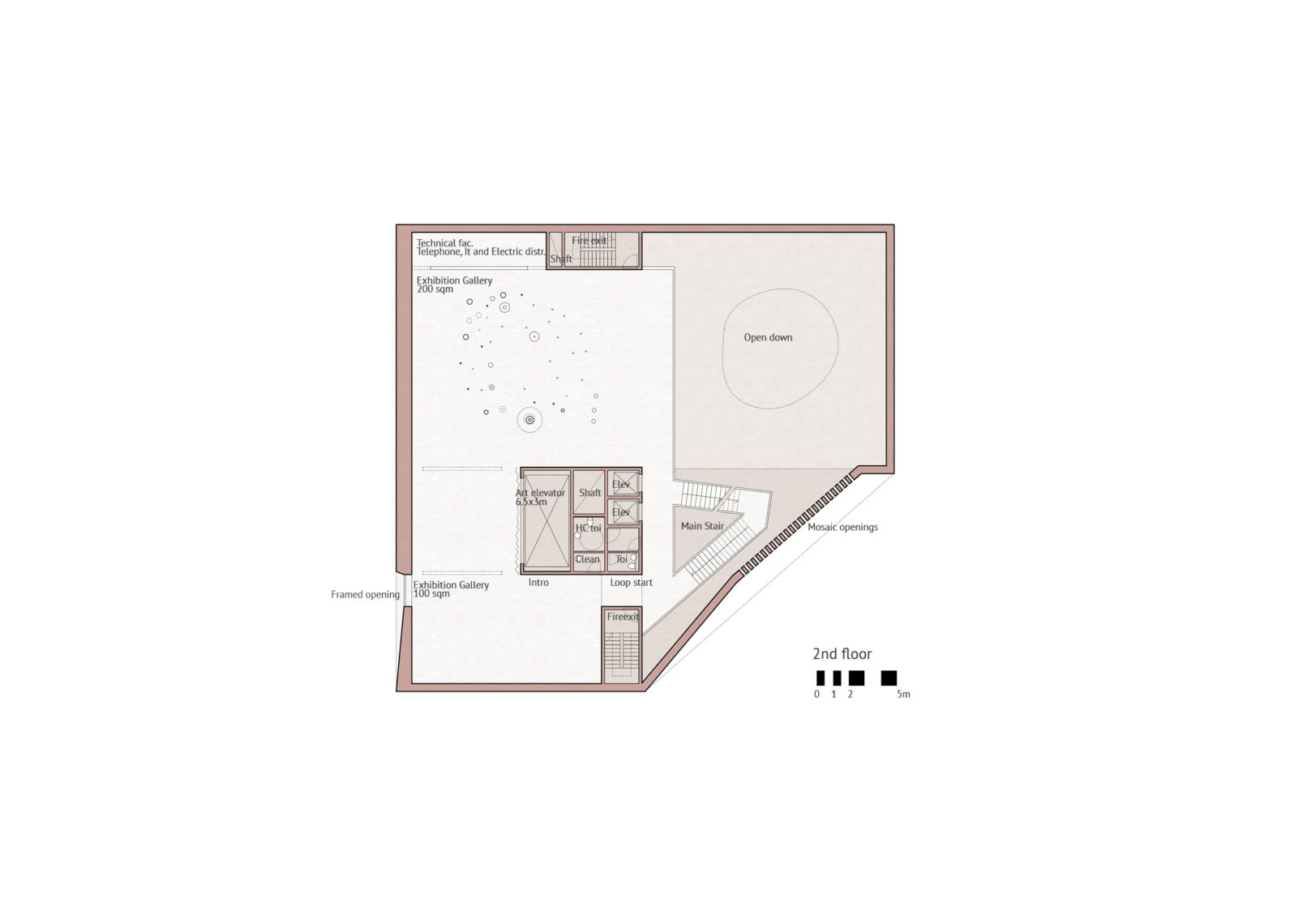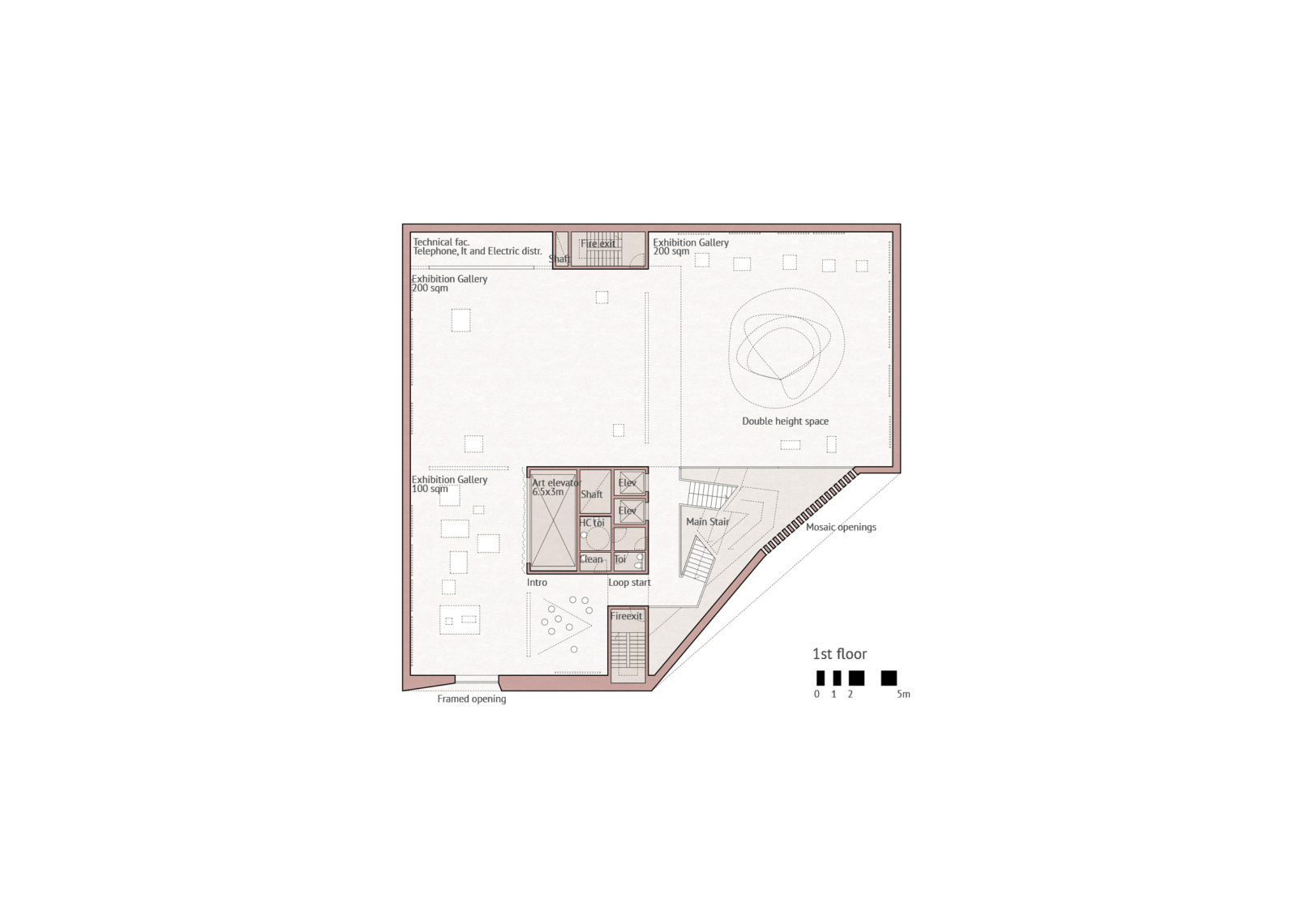 The Museum has an open foyer ground floor and five dividable exhibition levels above ground.