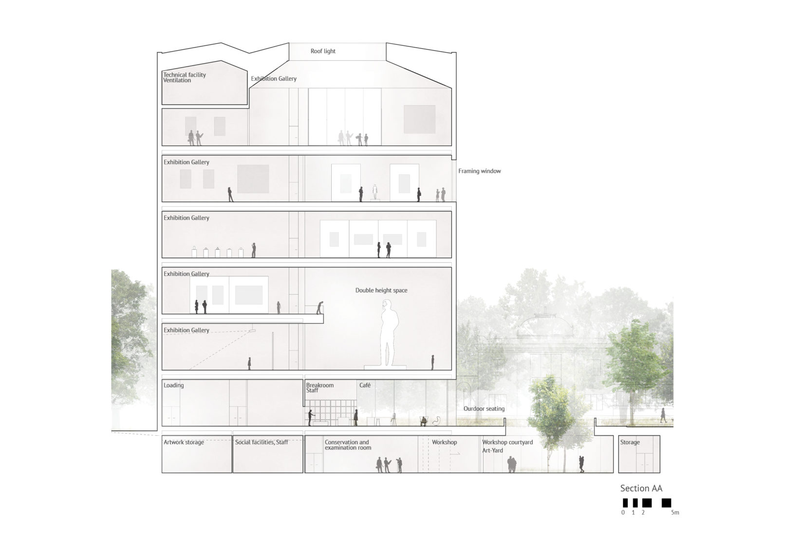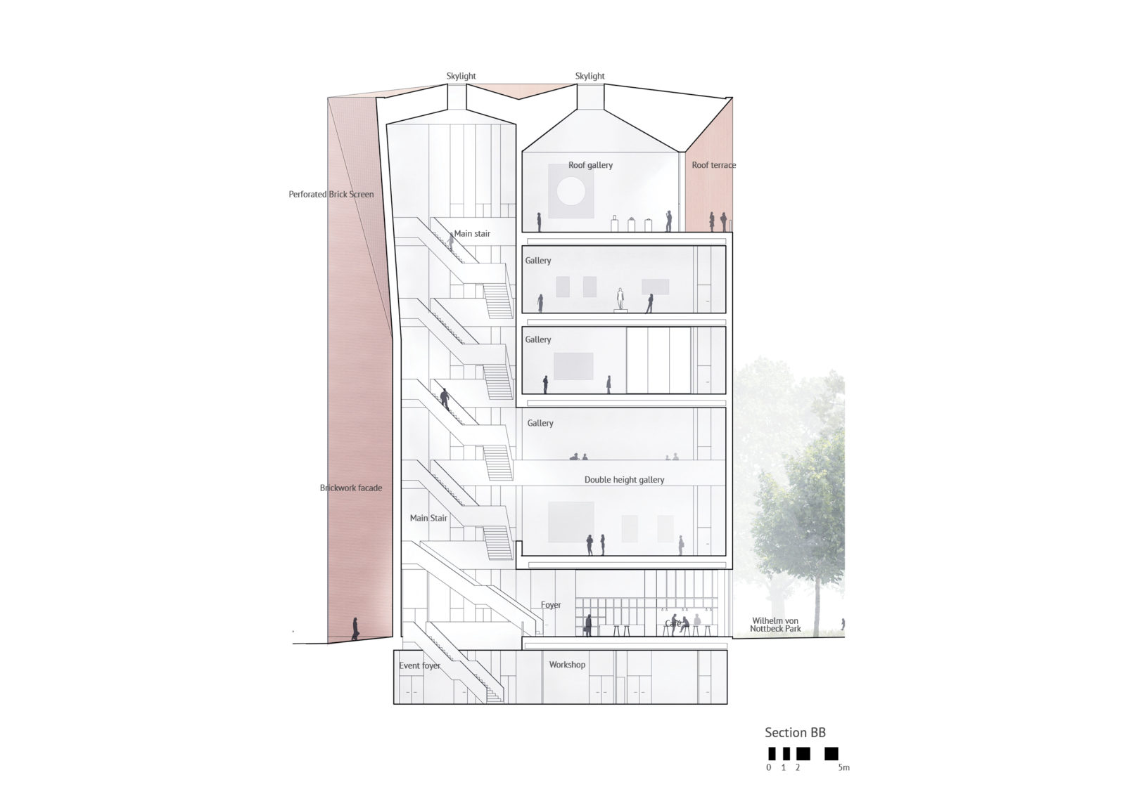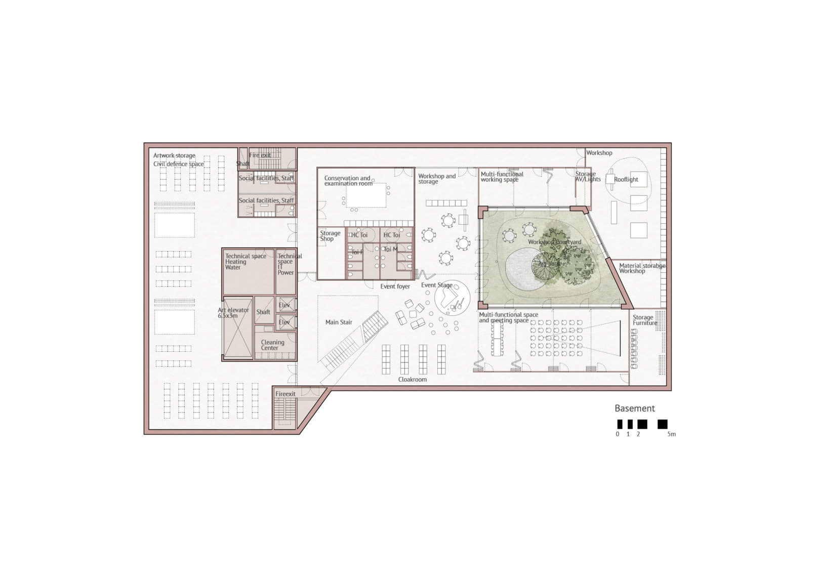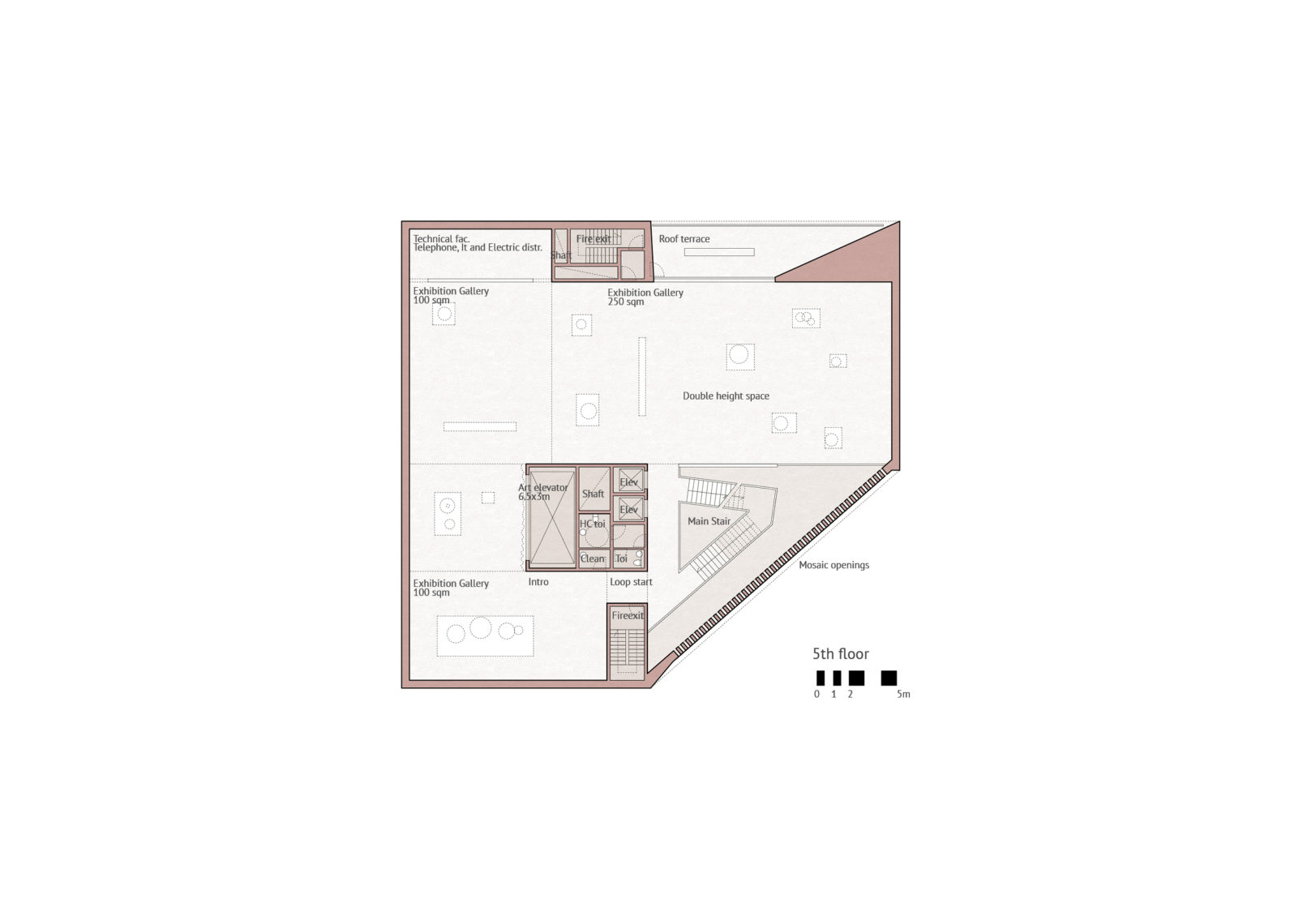 The Museum has an open foyer ground floor and five dividable exhibition levels above ground.