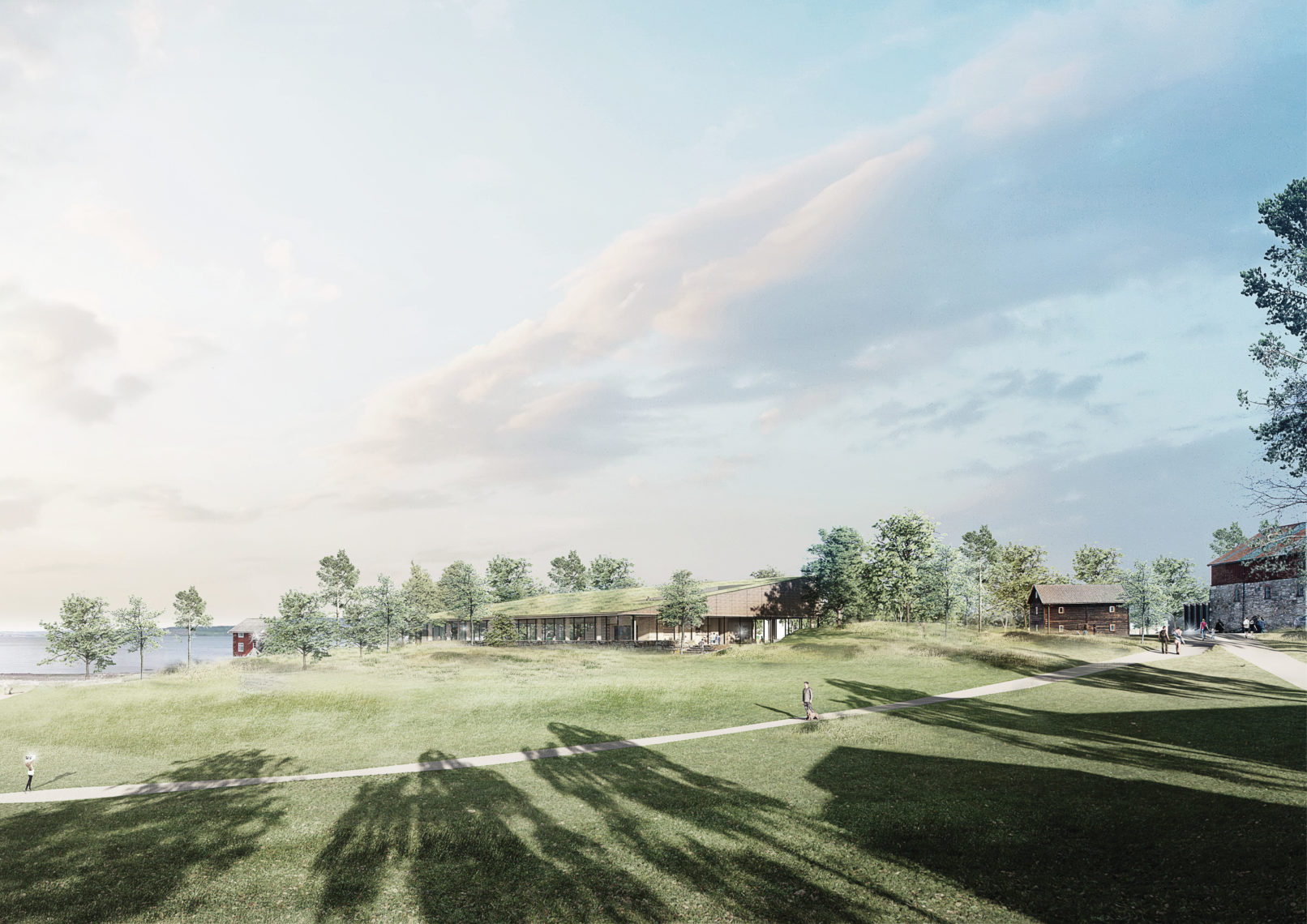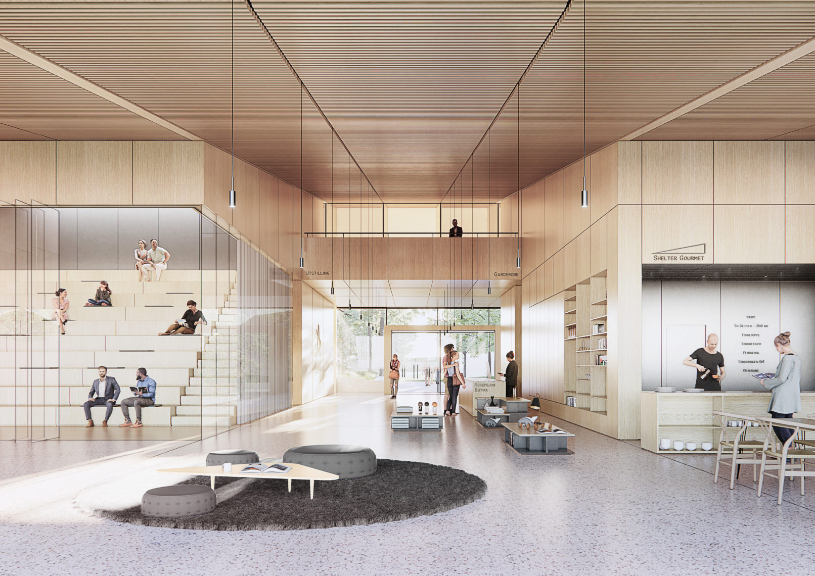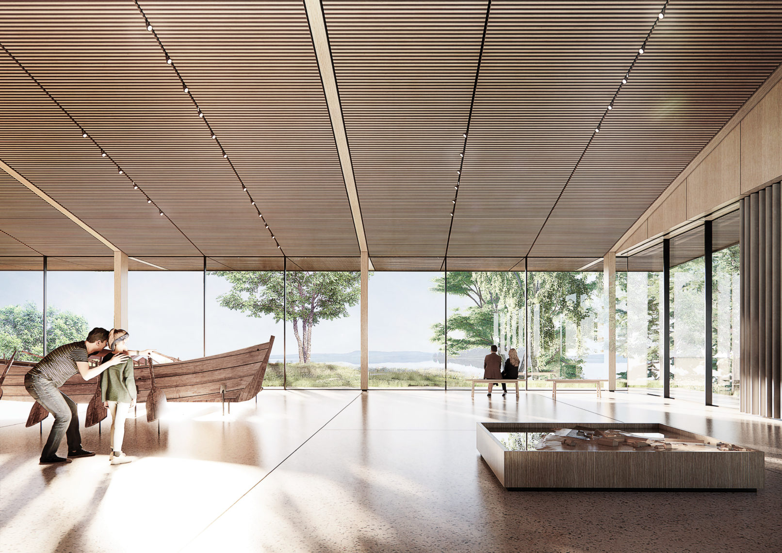 A hovering green roof invites everyone to enter. An elegant roof which gently tilts down towards Mjøsa, and integrates the house within the beautiful landscape. All main spaces under the shelter have panorama views over the water. Underneath the protective roof, the house is open, robust, and has a flexible frame with countless possibilities of arranging different exhibitions and events. The goal of the new museum is to contribute to bringing Anno Museum into the future with a flexible, practical, and sustainable museum and culture house ready for change.