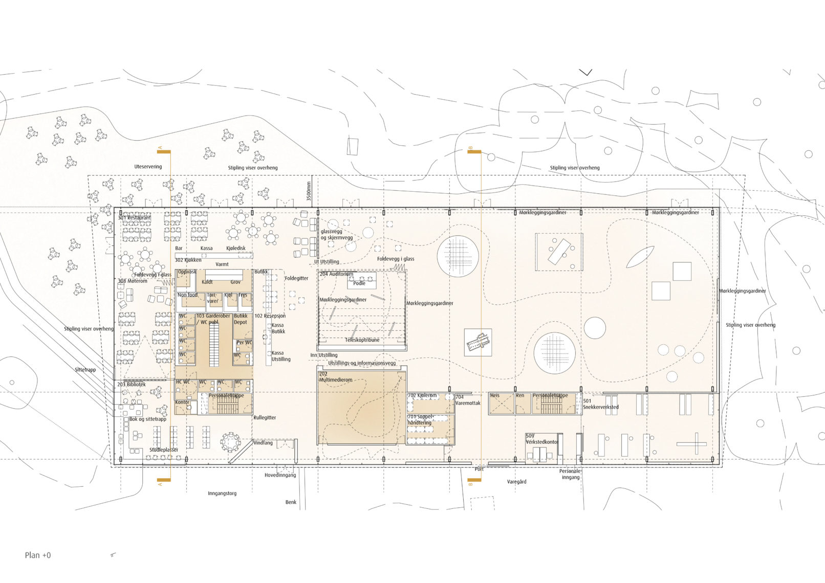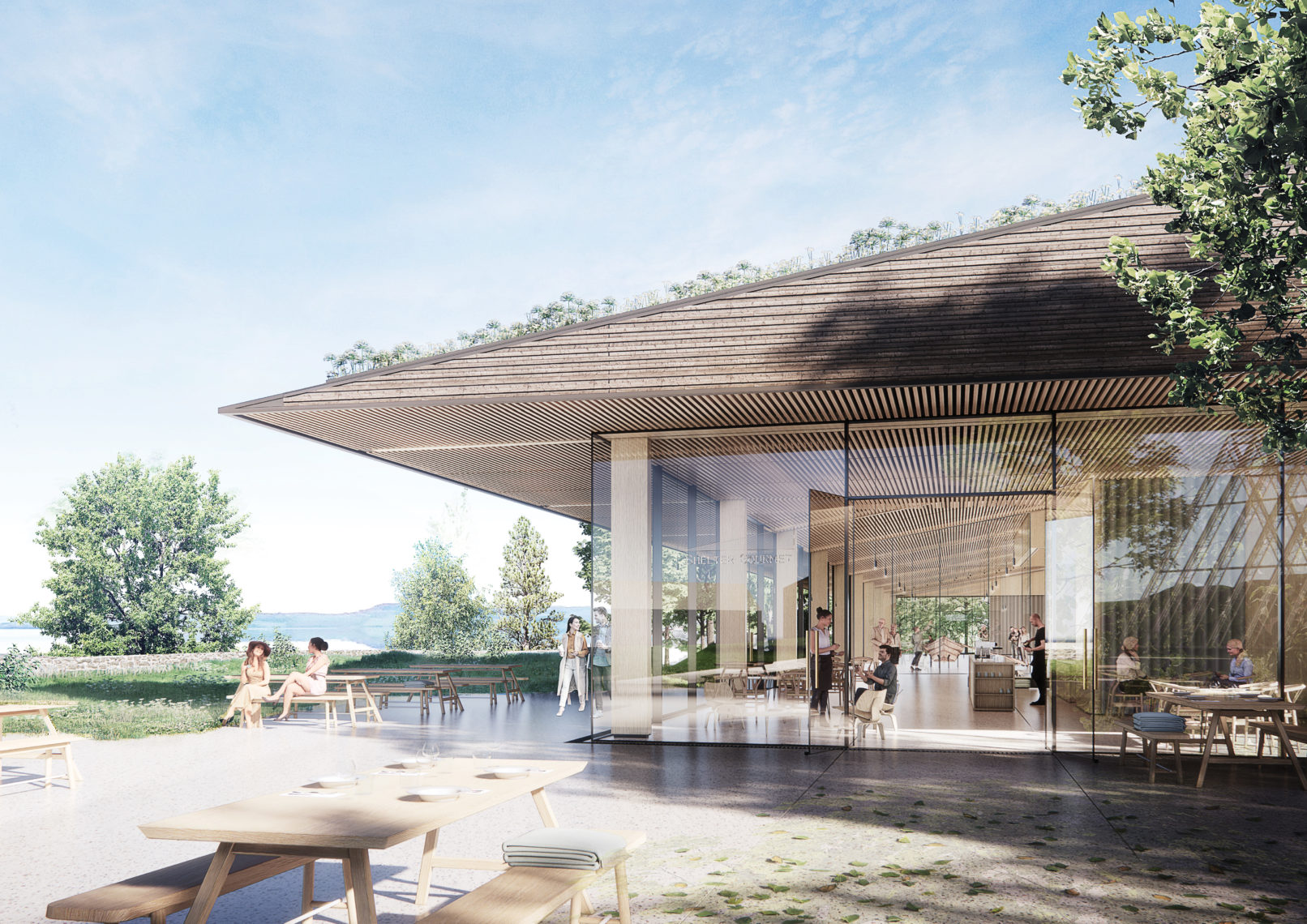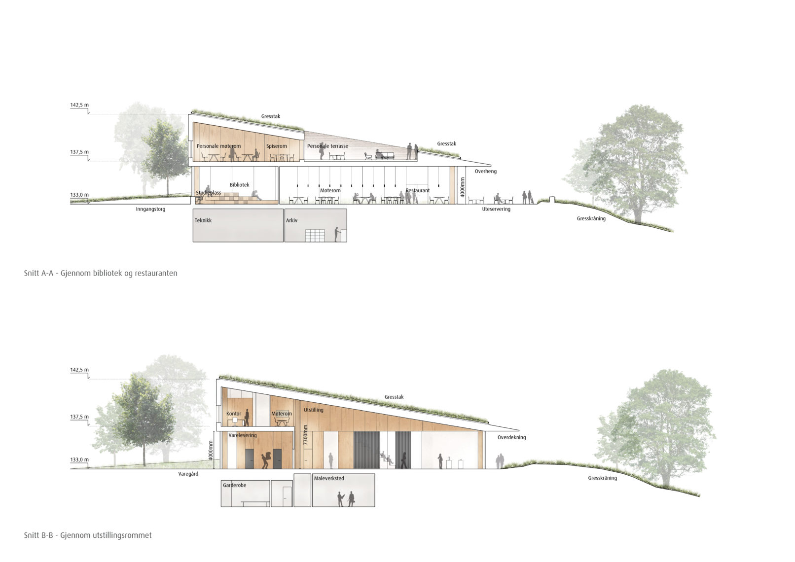 A hovering green roof invites everyone to enter. An elegant roof which gently tilts down towards Mjøsa, and integrates the house within the beautiful landscape. All main spaces under the shelter have panorama views over the water. Underneath the protective roof, the house is open, robust, and has a flexible frame with countless possibilities of arranging different exhibitions and events. The goal of the new museum is to contribute to bringing Anno Museum into the future with a flexible, practical, and sustainable museum and culture house ready for change.