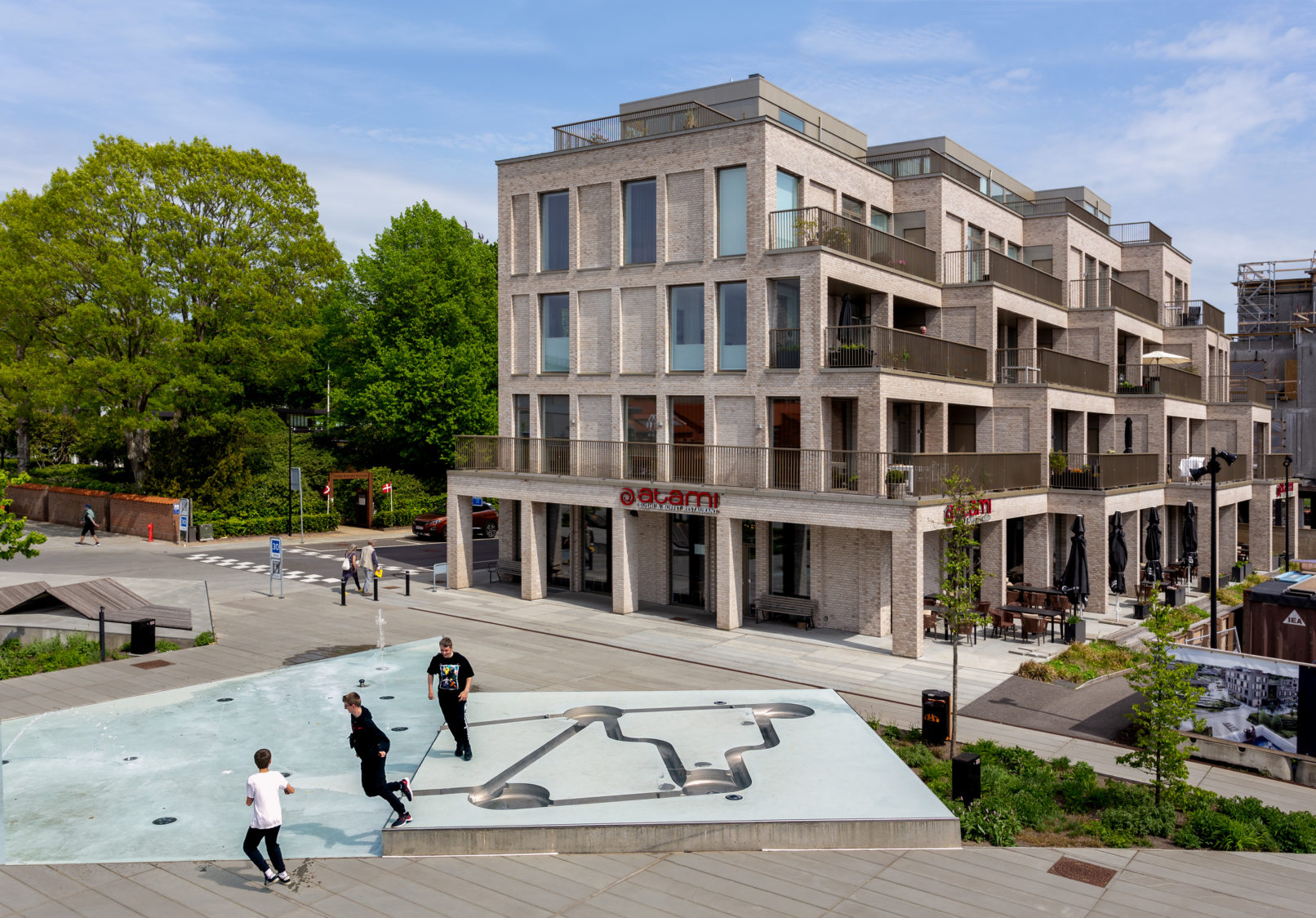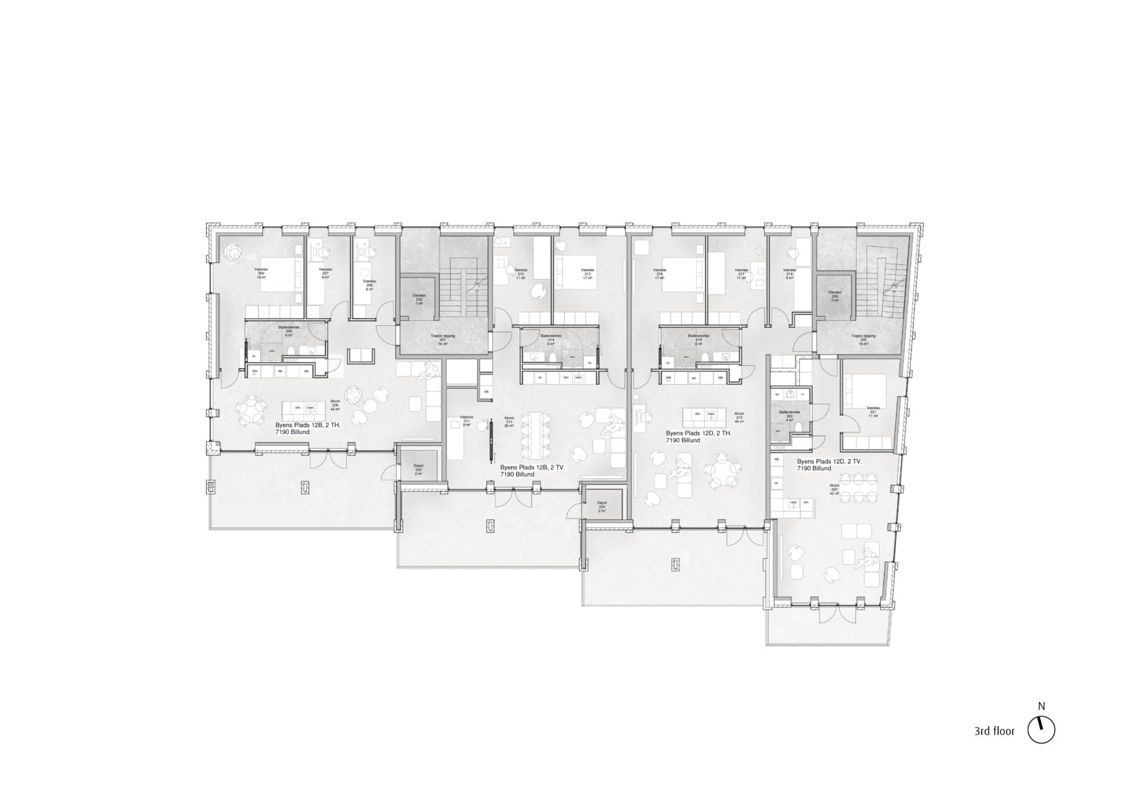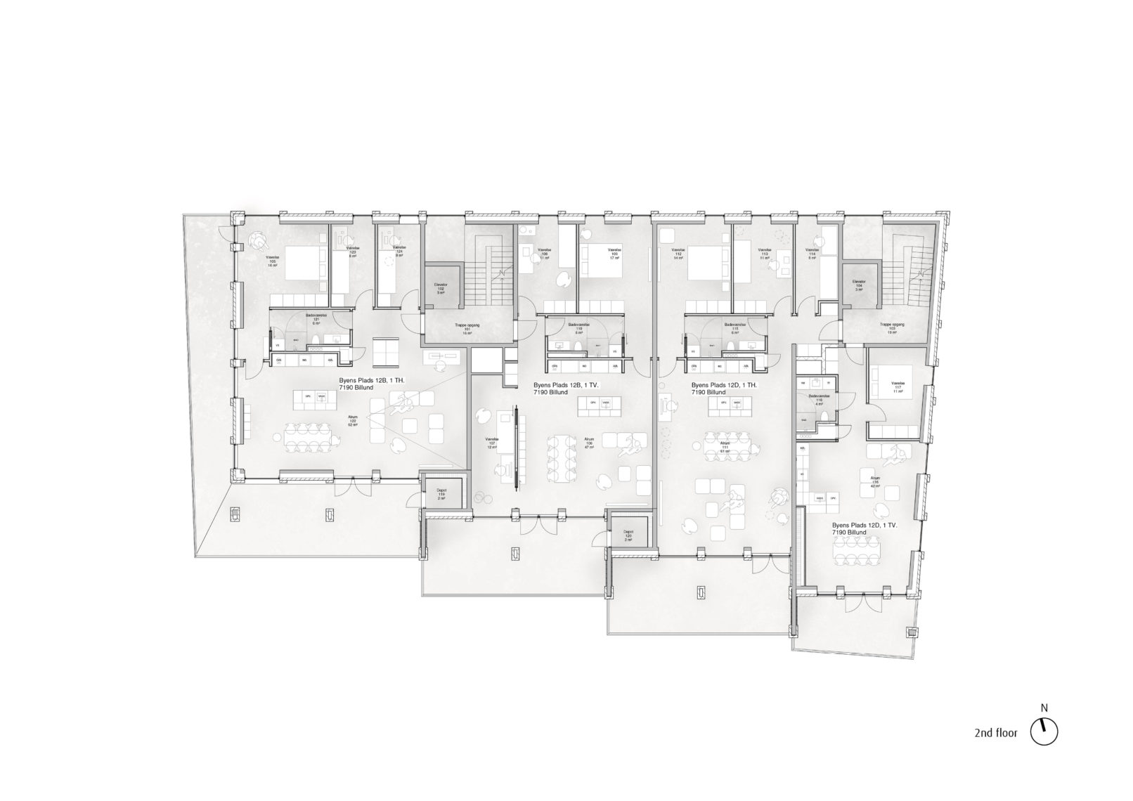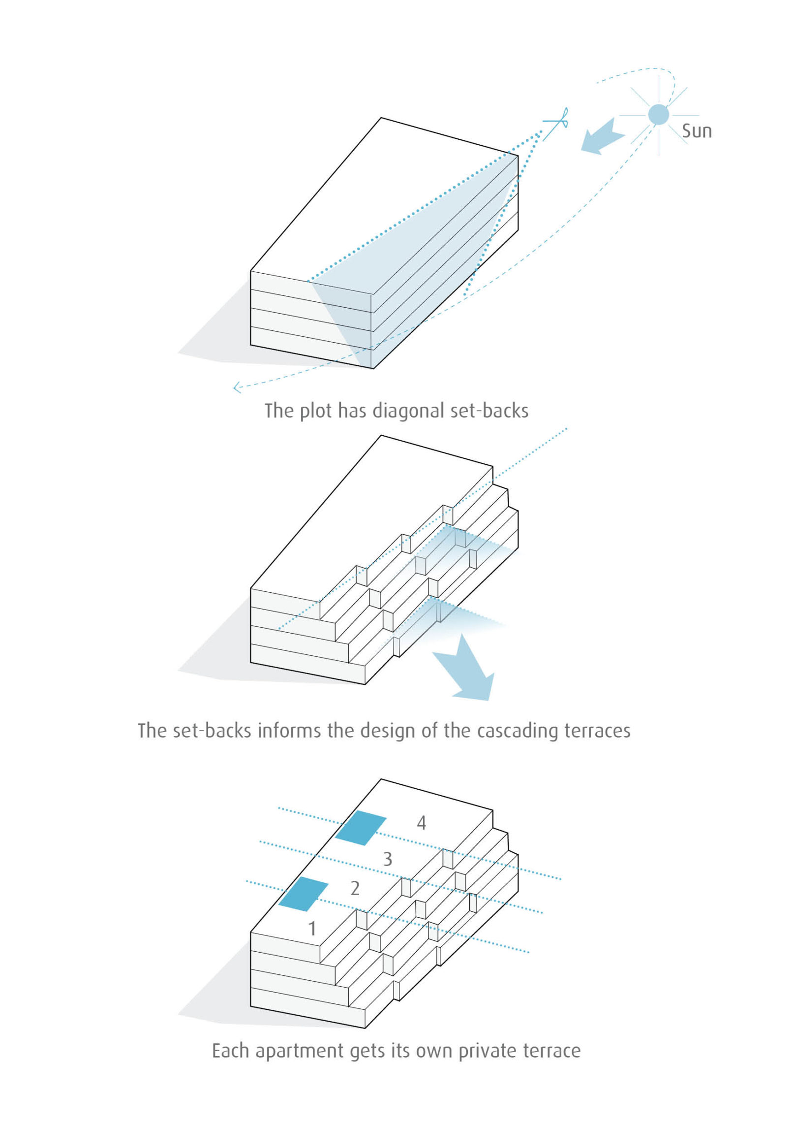 Billund Terrace is a sculptural apartment building maximized for sunlight and context. Adjacent to the LEGO House, it makes use of a blocky aesthetic to emphasize neighborhood cohesiveness. Large terraces oriented westward to the town square provide each apartment with a view, privacy, and ample light. The stacked blocks terminate in a large roof terrace that includes glass garden rooms.