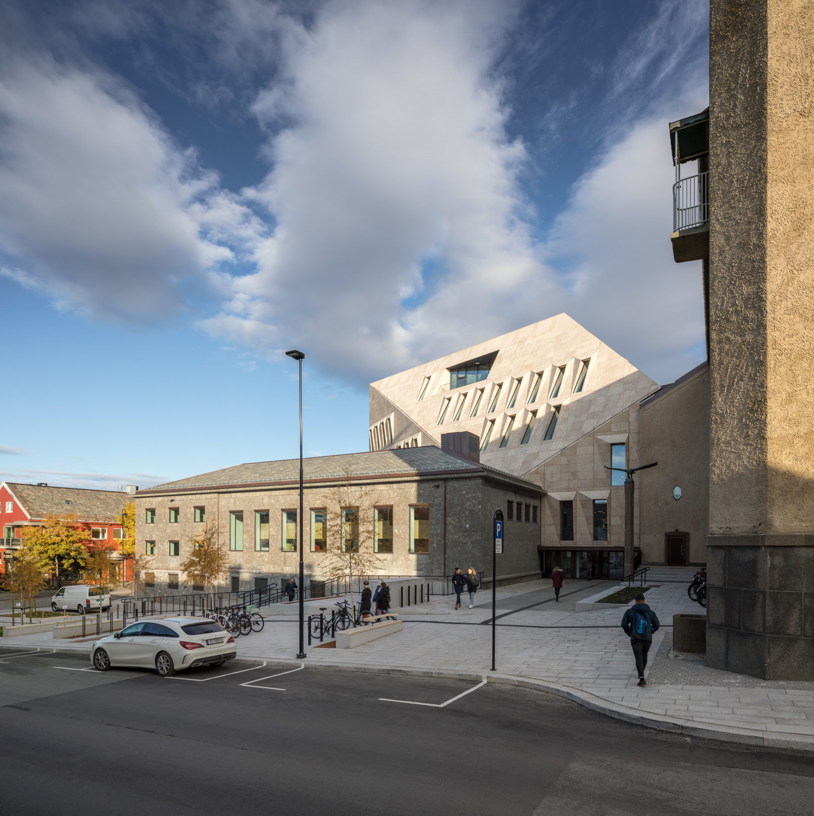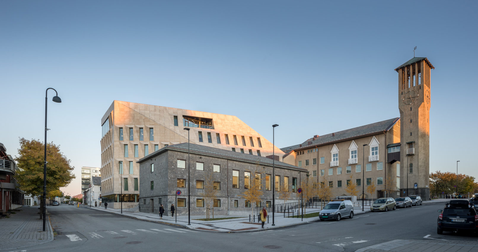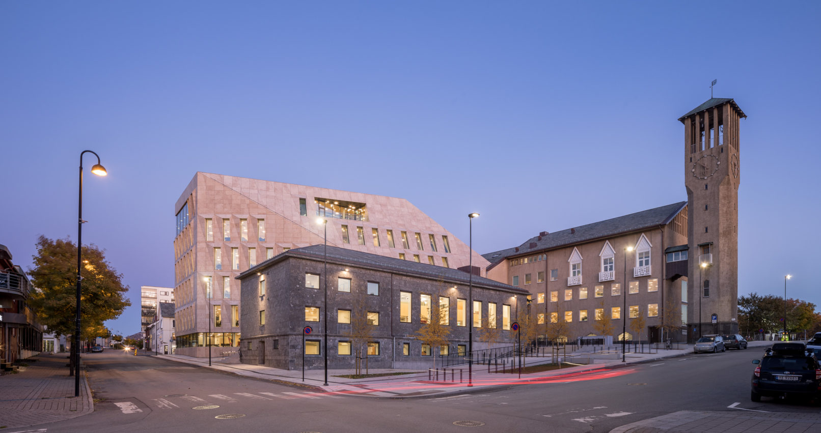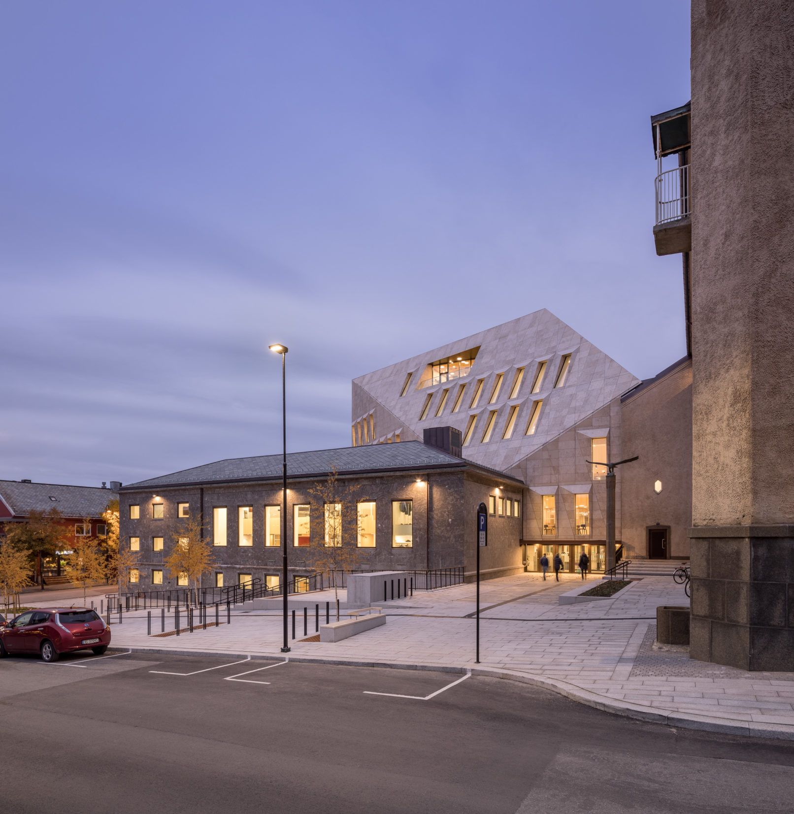 The design of a new town hall for Bodø involves the renovation and transformation of three existing, preservation-worthy buildings. The insertion of a new work space for 400 employees takes the form of a stone prism, faceted to allow sunlight to reach the preserved buildings. The new work space stitches together the three old buildings, becoming the heart and central meeting place of the town hall campus. A canteen with panoramic views caps the new building.