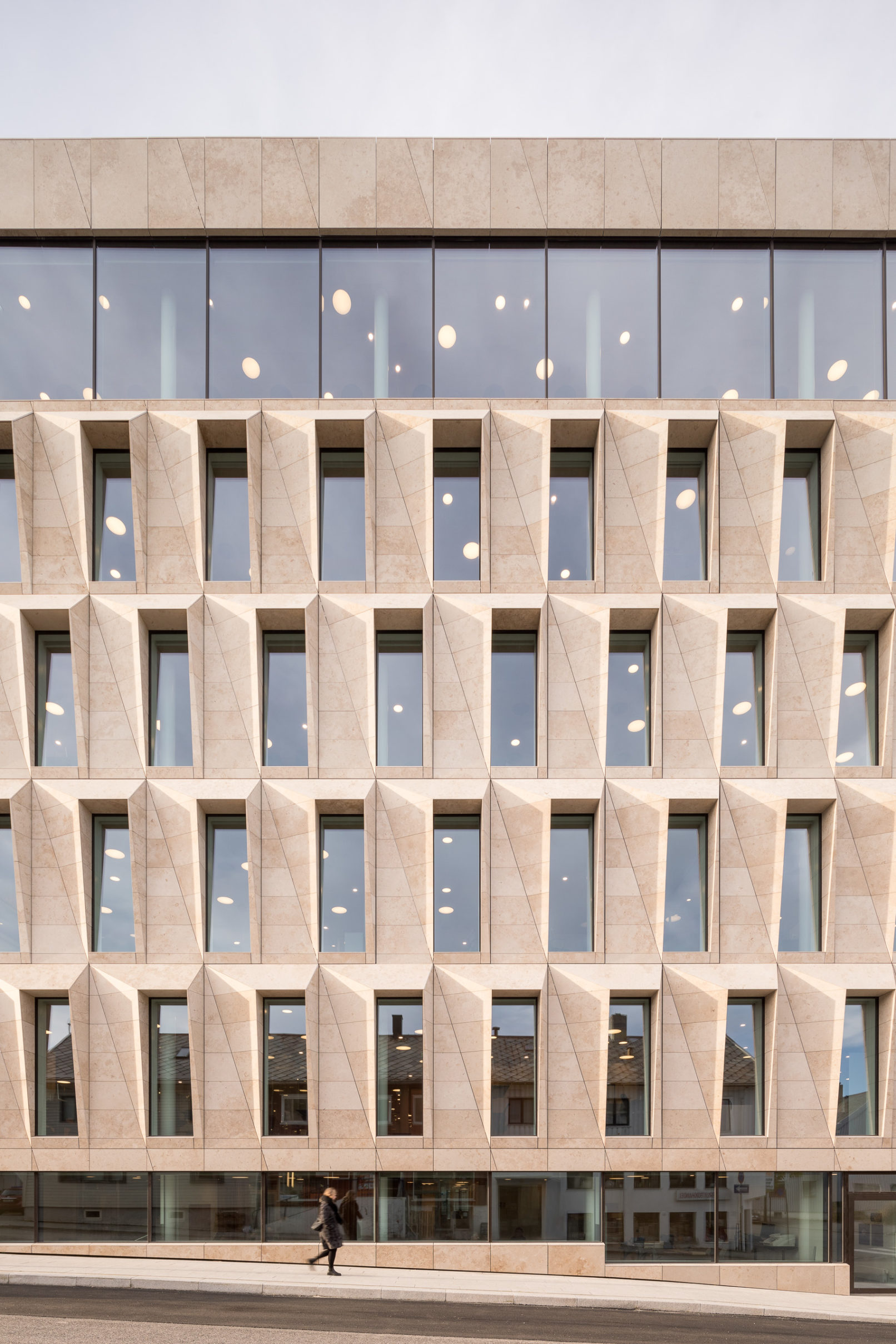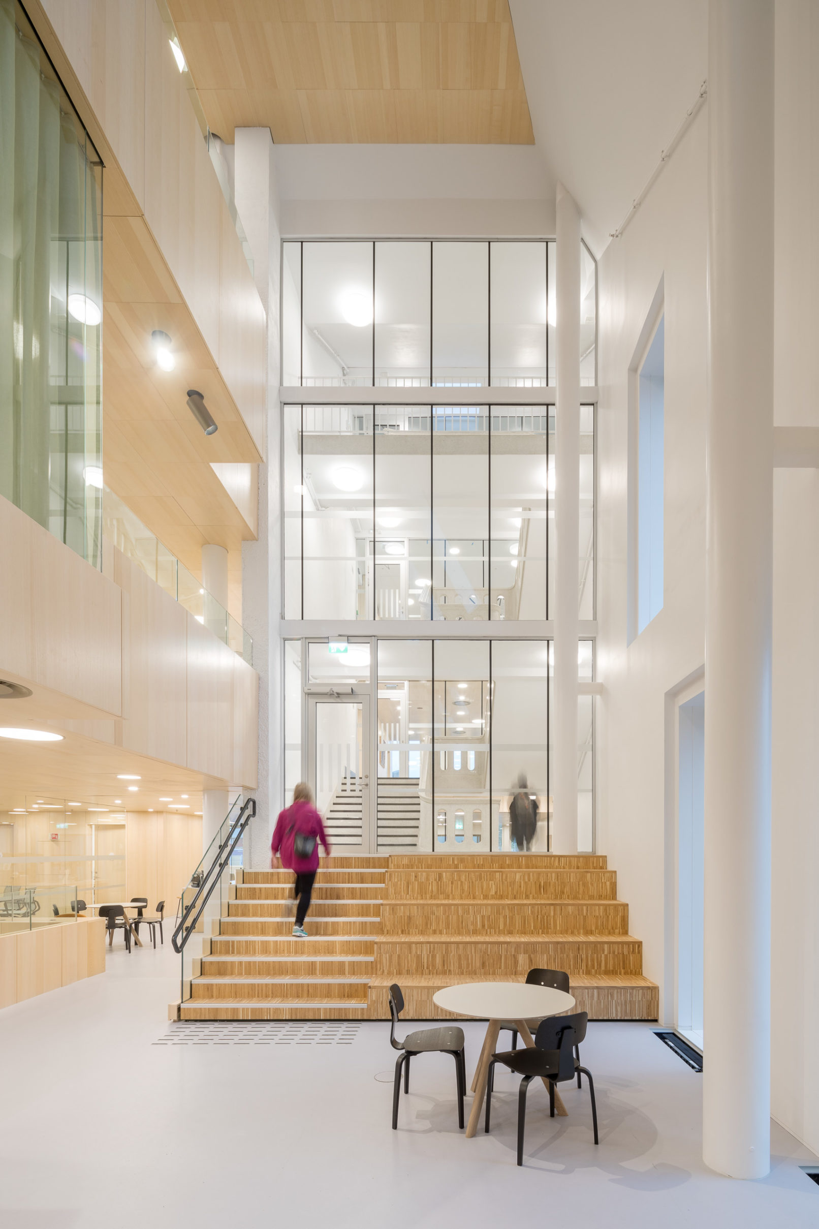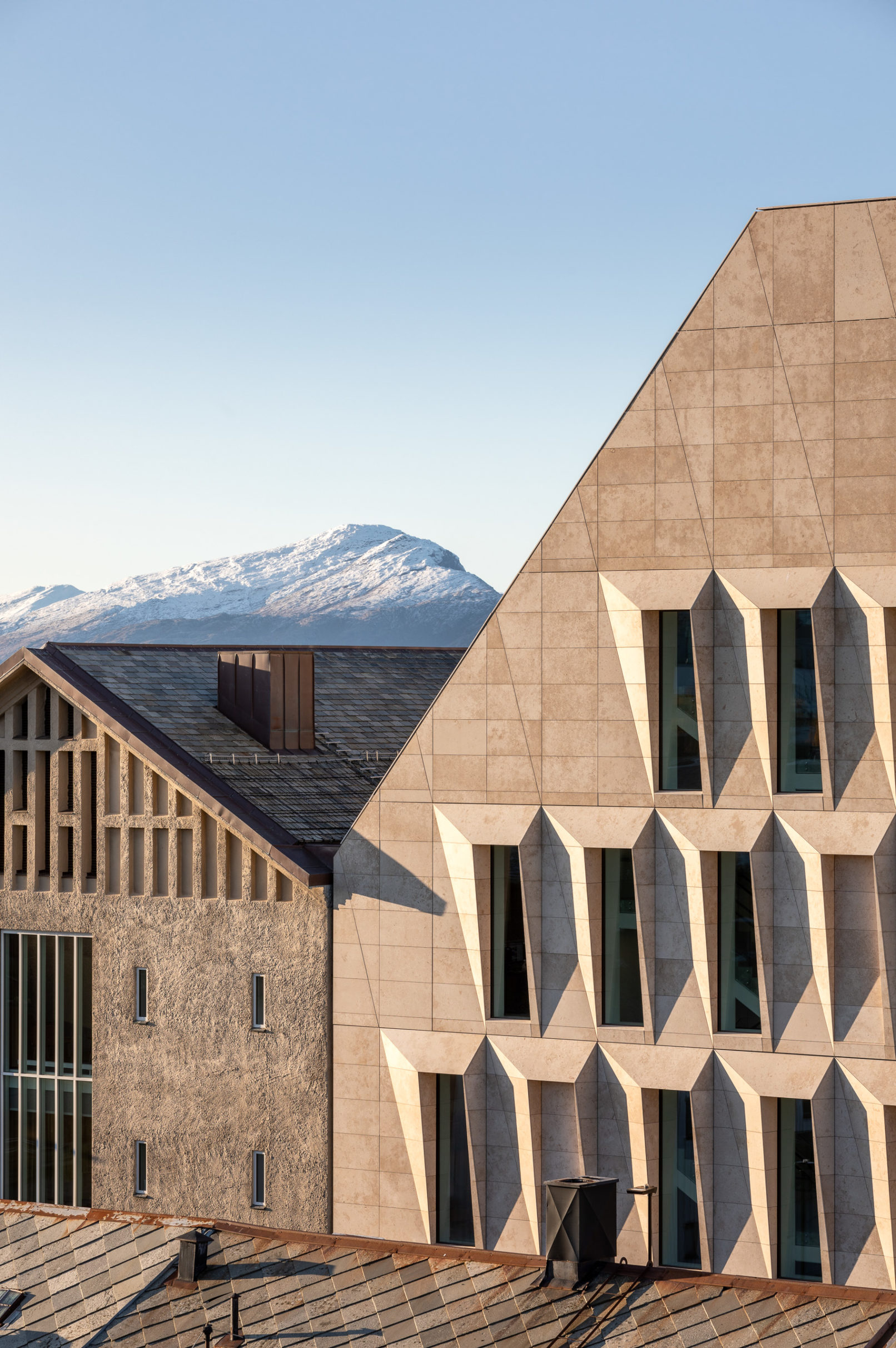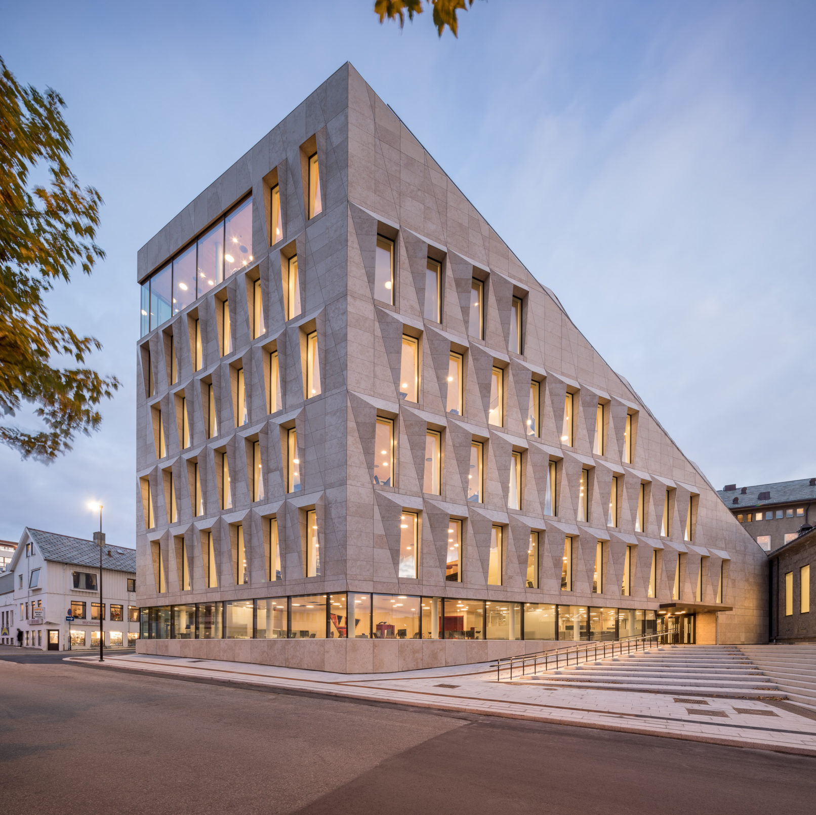 The design of a new town hall for Bodø involves the renovation and transformation of three existing, preservation-worthy buildings. The insertion of a new work space for 400 employees takes the form of a stone prism, faceted to allow sunlight to reach the preserved buildings. The new work space stitches together the three old buildings, becoming the heart and central meeting place of the town hall campus. A canteen with panoramic views caps the new building.