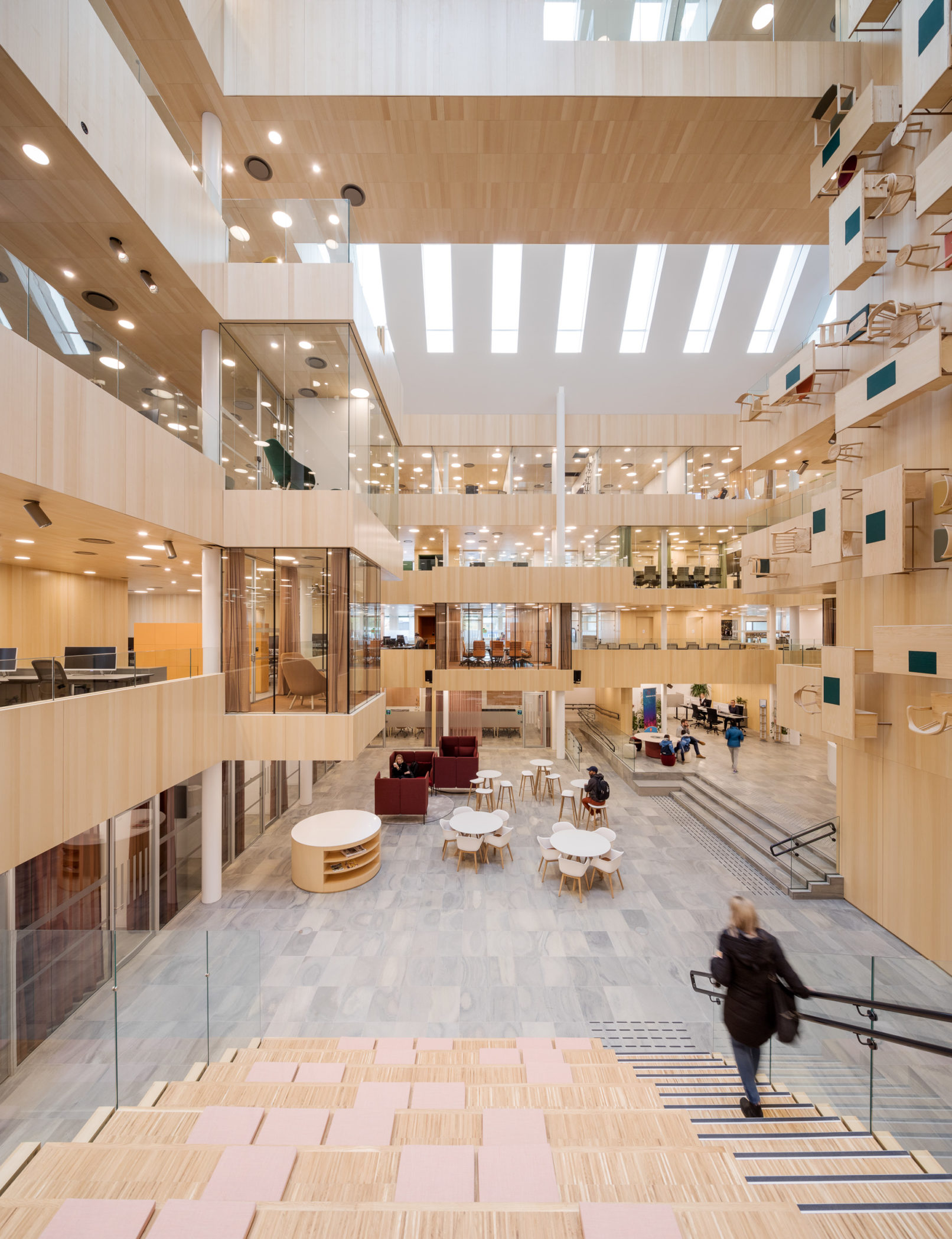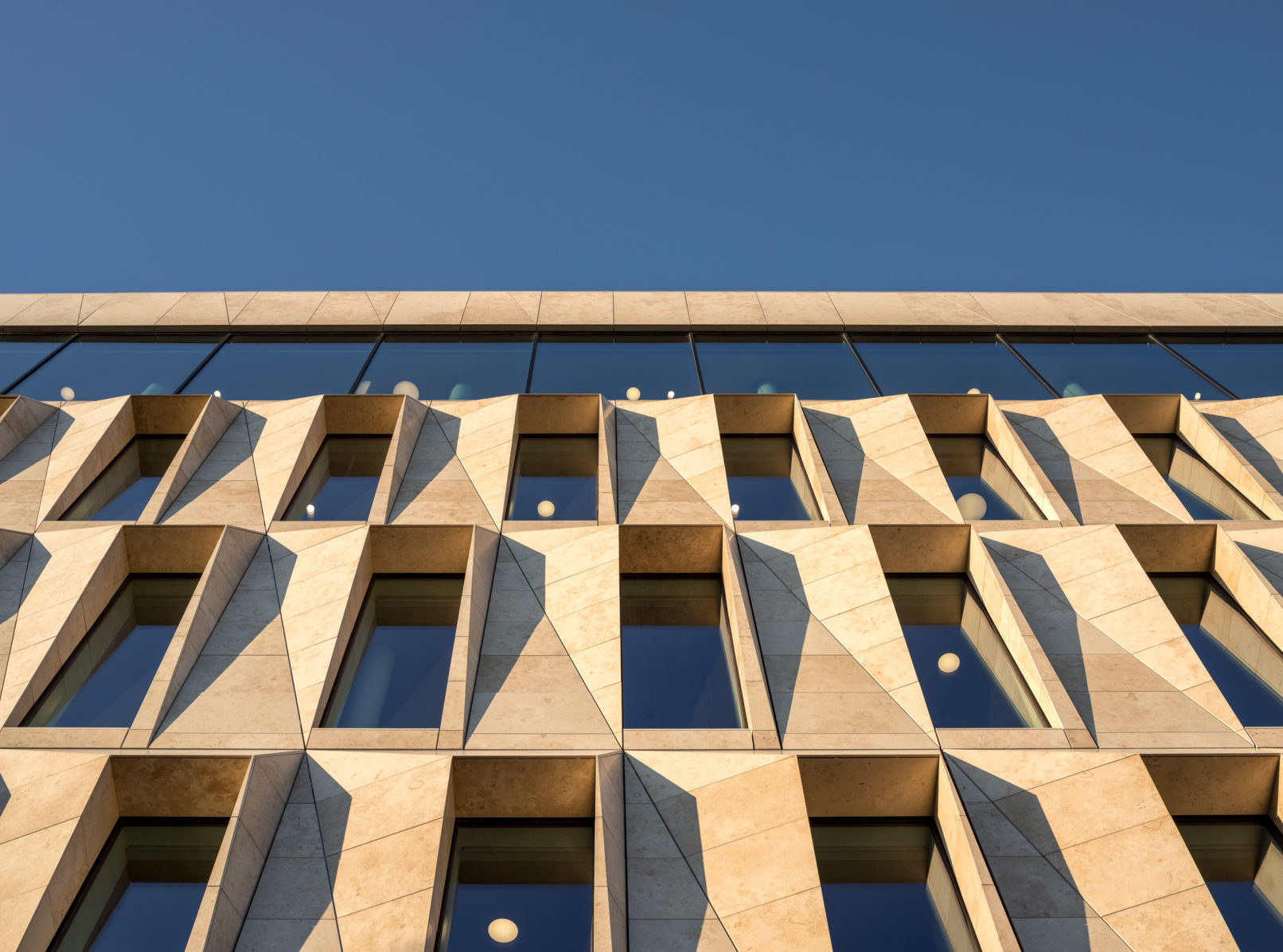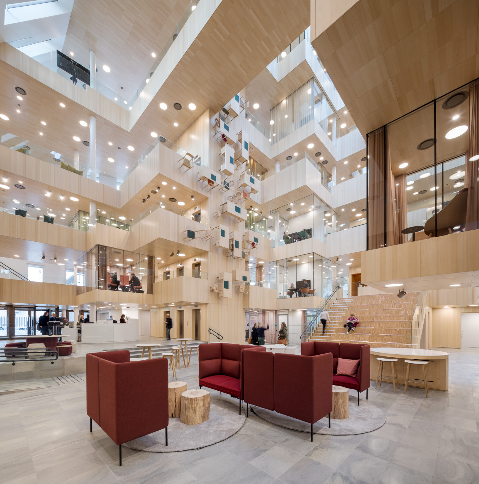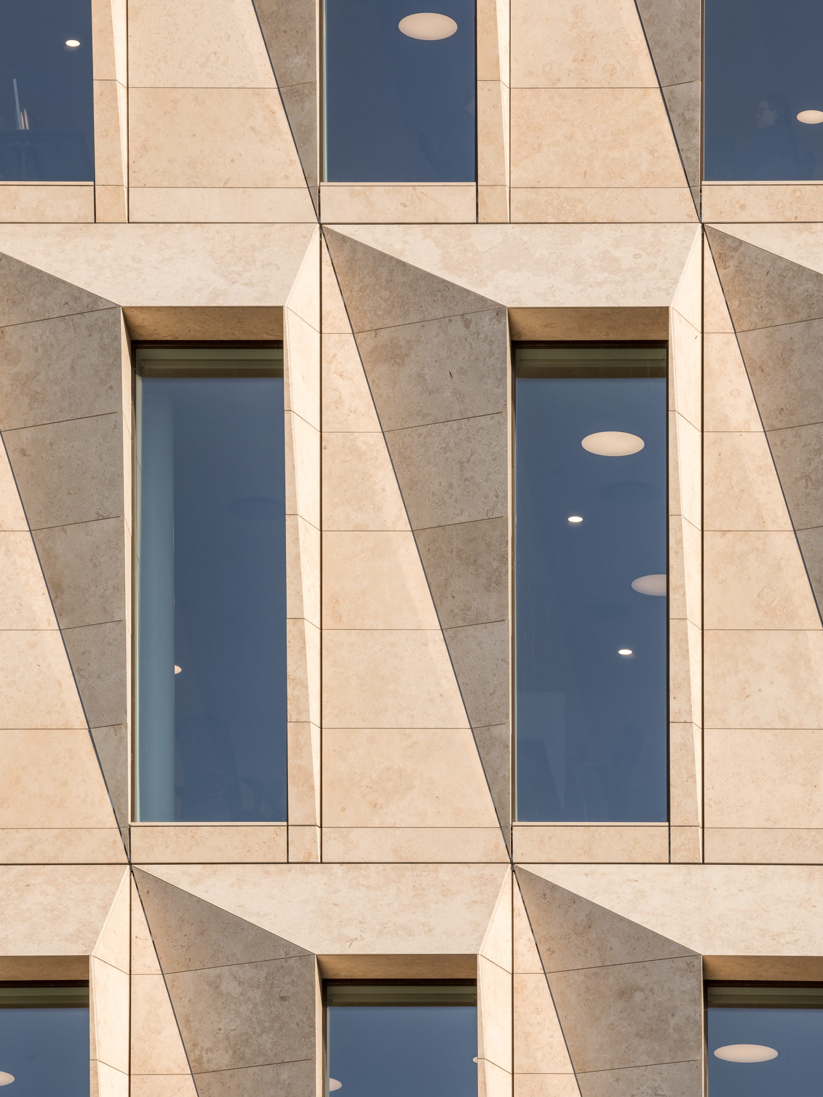 The design of a new town hall for Bodø involves the renovation and transformation of three existing, preservation-worthy buildings. The insertion of a new work space for 400 employees takes the form of a stone prism, faceted to allow sunlight to reach the preserved buildings. The new work space stitches together the three old buildings, becoming the heart and central meeting place of the town hall campus. A canteen with panoramic views caps the new building.