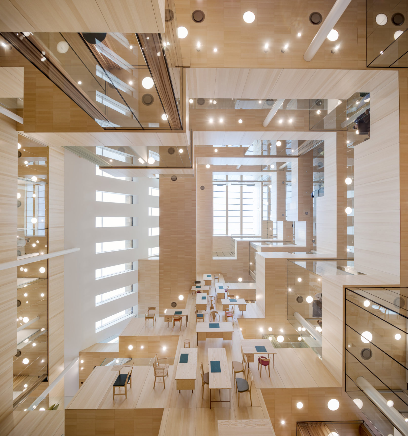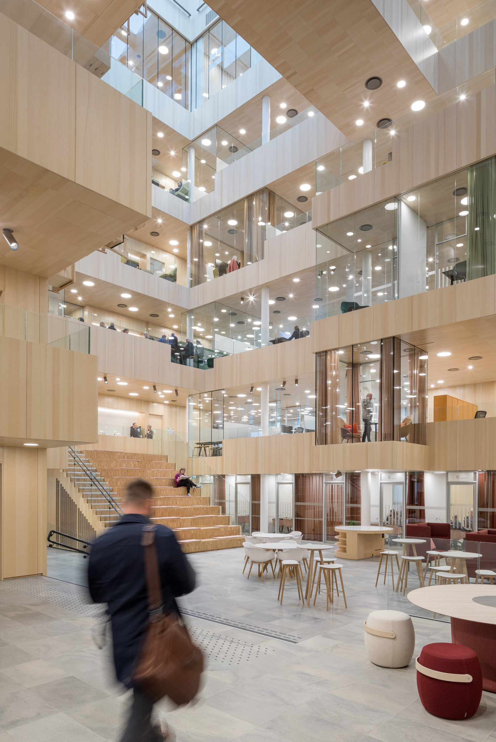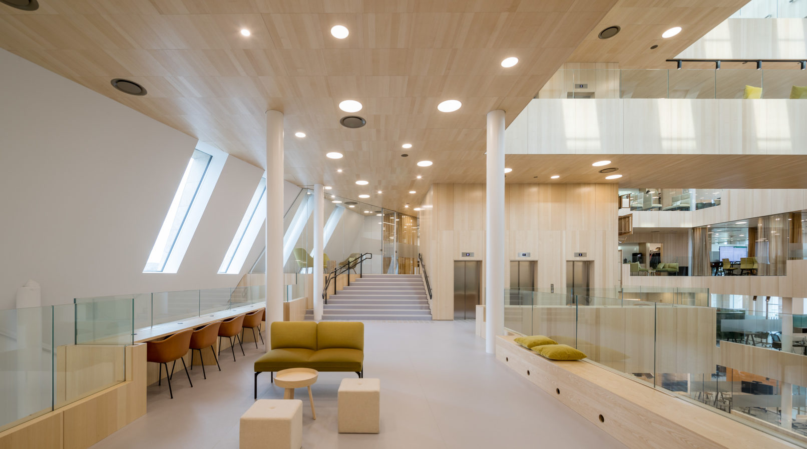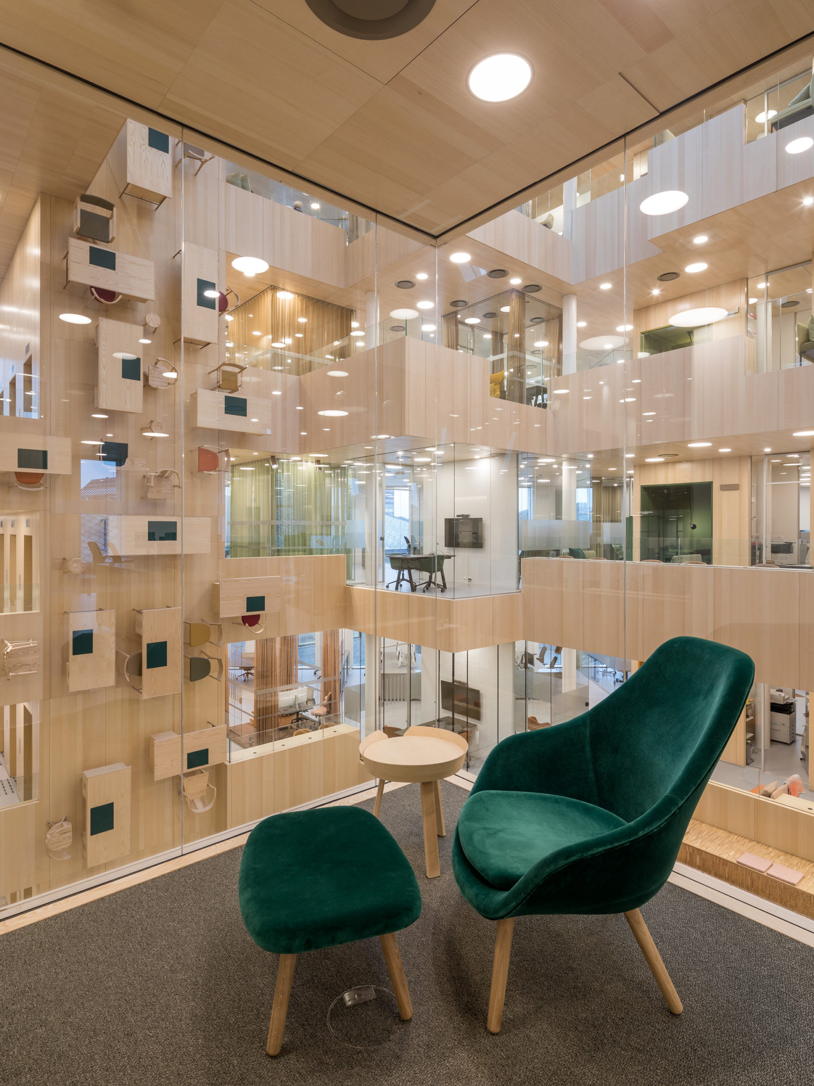 The design of a new town hall for Bodø involves the renovation and transformation of three existing, preservation-worthy buildings. The insertion of a new work space for 400 employees takes the form of a stone prism, faceted to allow sunlight to reach the preserved buildings. The new work space stitches together the three old buildings, becoming the heart and central meeting place of the town hall campus. A canteen with panoramic views caps the new building.