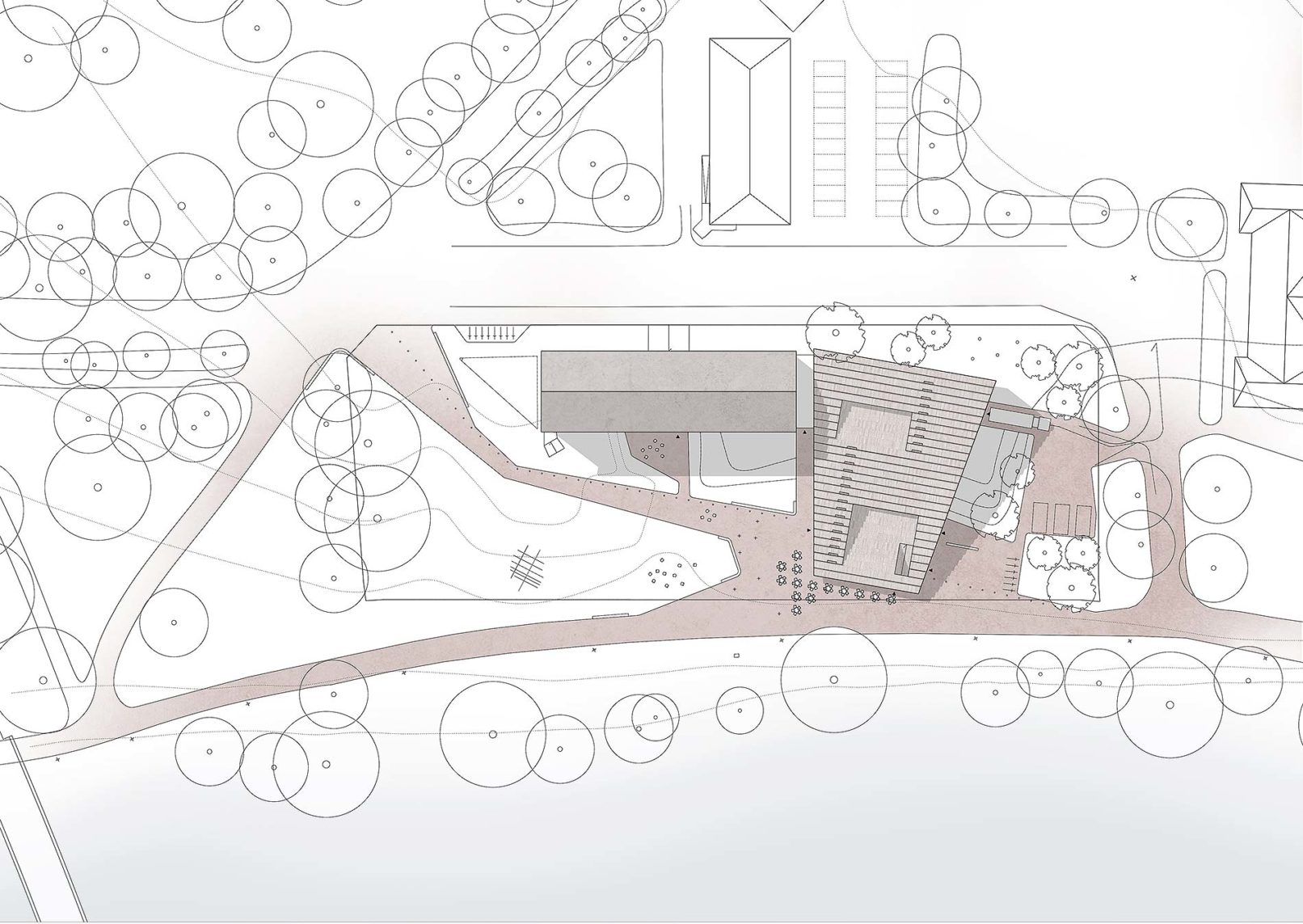 The extension is designed as a characteristic staircasing sculpture where the art is lifted and floats over the park.