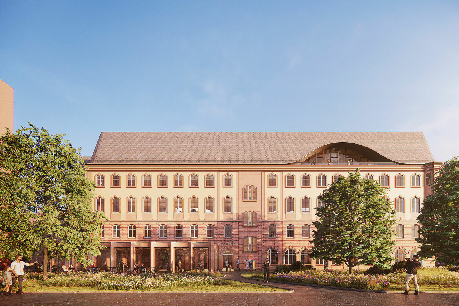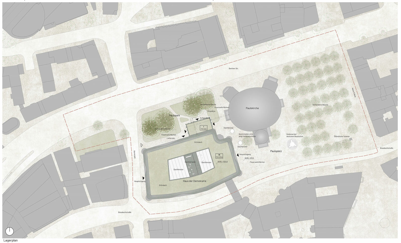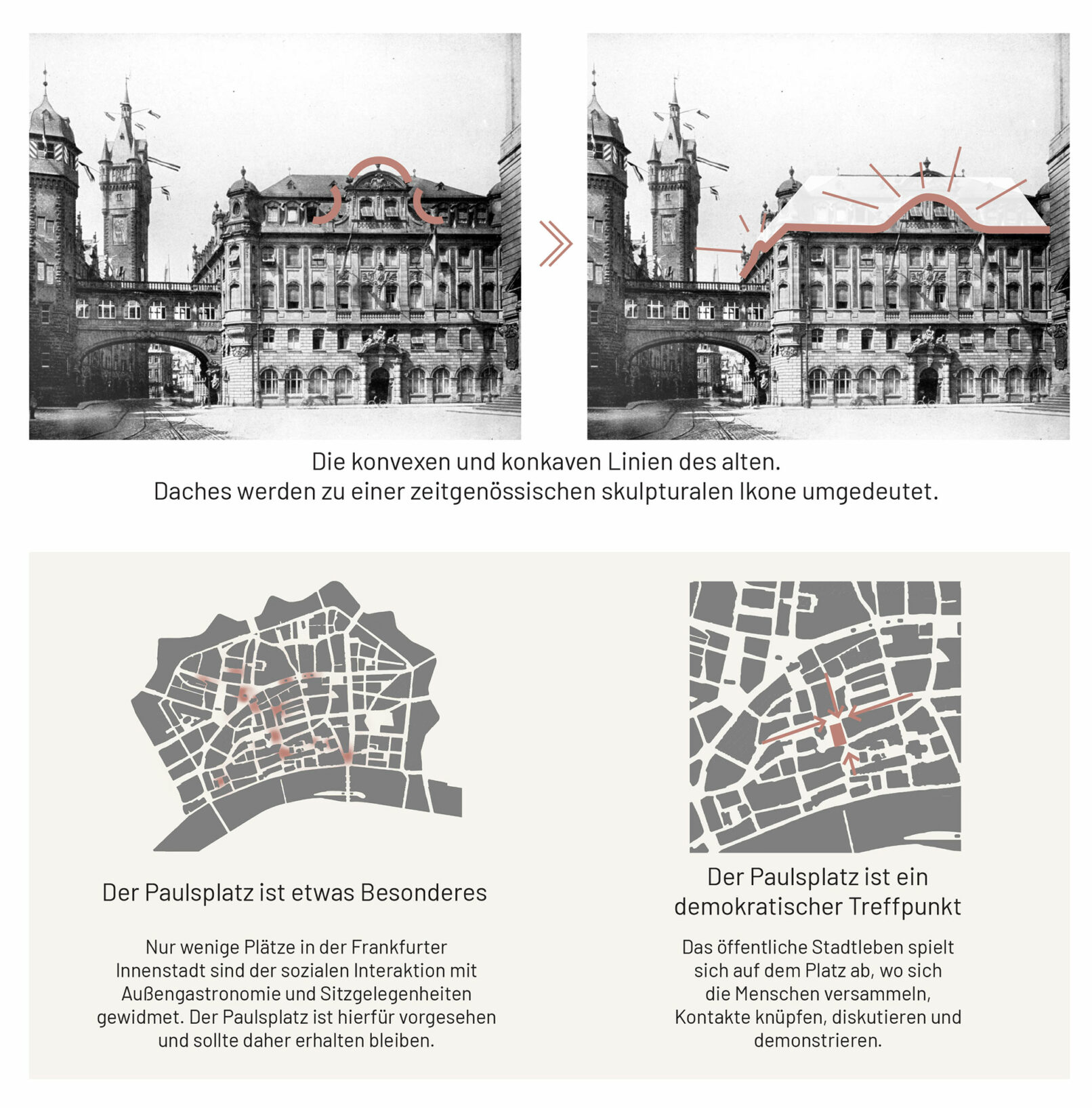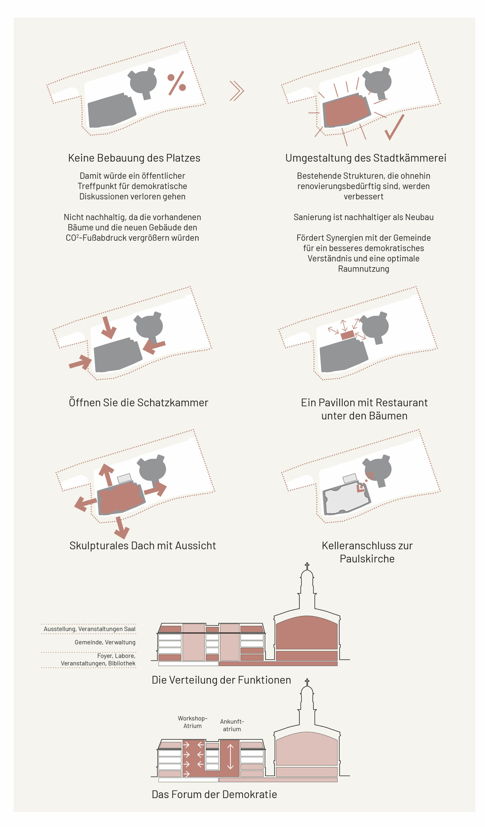 The House of Democracy is envisioned as a beacon of democracy – A forum for daily dialogue among citizens – the very foundation of a thriving democracy. The municipal administration in the former treasury represents today’s democracy in action. Paulskirche symbolizes the birth of German democratic unity. Placing The House of Democracy in the old city treasury provides the unique opportunity to unite the symbolic birth of democracy with today’s democracy in action and future evolution of society. Sustainability is at the core of this vision. Transforming the existing city treasury is both environmentally responsible and contextually respectful. We envision The House of Democracy as a vibrant and welcoming space that interweaves the history of democracy, its daily functioning, and the development of future policies – a living institution in the heart of the city. A destination that inspires engagement and participation with multiple entrances and a small new extension into Paulspark with a public restaurant, greenery and a cozy pocket park with outdoor seating beneath the trees. The top is redesigned as a sculptural beacon for The House of Democracy, inspired by Frankfurt’s historic city hall roofs. With large, curved openings, it introduces a contemporary interpretation of tradition. Like a curtain being lifted, it reveals the democratic activities within and provides panoramic views to the surrounding city and beautiful daylight. In this way, the former treasury becomes not just a renewed building, but a sustainable inviting beacon of democracy in balance with the past – open, participatory, and future-facing.