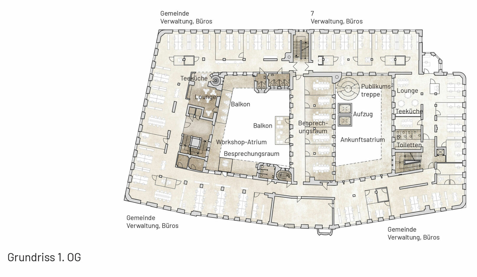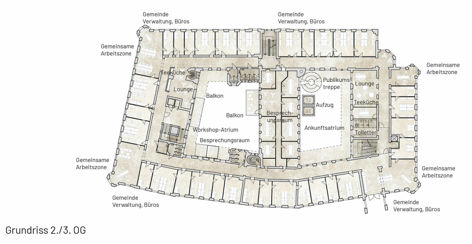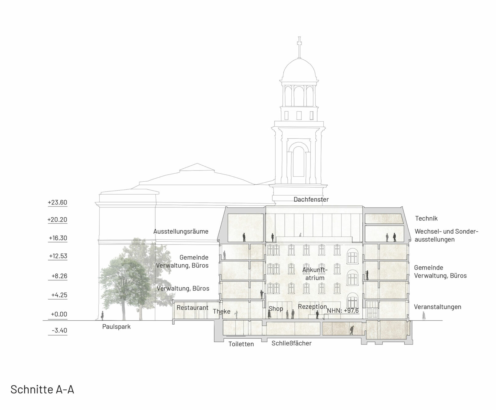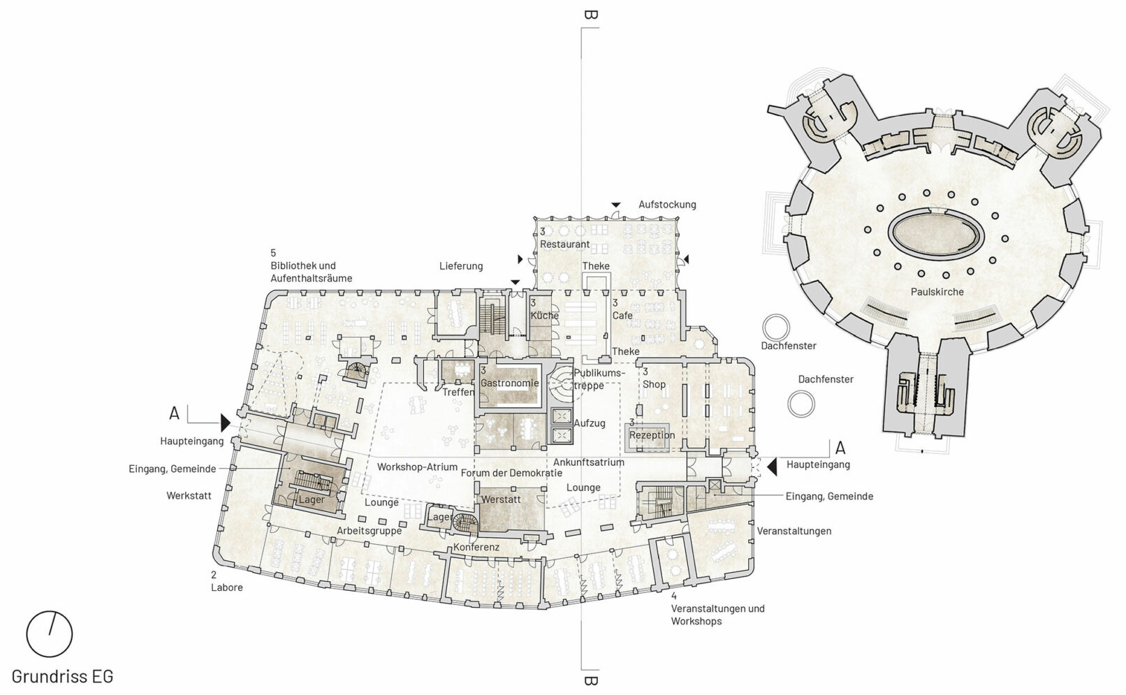 The House of Democracy is envisioned as a beacon of democracy – A forum for daily dialogue among citizens – the very foundation of a thriving democracy. The municipal administration in the former treasury represents today’s democracy in action. Paulskirche symbolizes the birth of German democratic unity. Placing The House of Democracy in the old city treasury provides the unique opportunity to unite the symbolic birth of democracy with today’s democracy in action and future evolution of society. Sustainability is at the core of this vision. Transforming the existing city treasury is both environmentally responsible and contextually respectful. We envision The House of Democracy as a vibrant and welcoming space that interweaves the history of democracy, its daily functioning, and the development of future policies – a living institution in the heart of the city. A destination that inspires engagement and participation with multiple entrances and a small new extension into Paulspark with a public restaurant, greenery and a cozy pocket park with outdoor seating beneath the trees. The top is redesigned as a sculptural beacon for The House of Democracy, inspired by Frankfurt’s historic city hall roofs. With large, curved openings, it introduces a contemporary interpretation of tradition. Like a curtain being lifted, it reveals the democratic activities within and provides panoramic views to the surrounding city and beautiful daylight. In this way, the former treasury becomes not just a renewed building, but a sustainable inviting beacon of democracy in balance with the past – open, participatory, and future-facing.