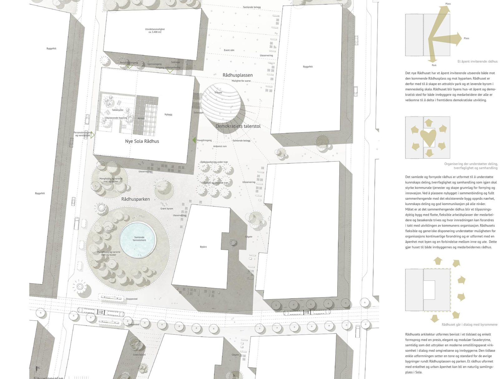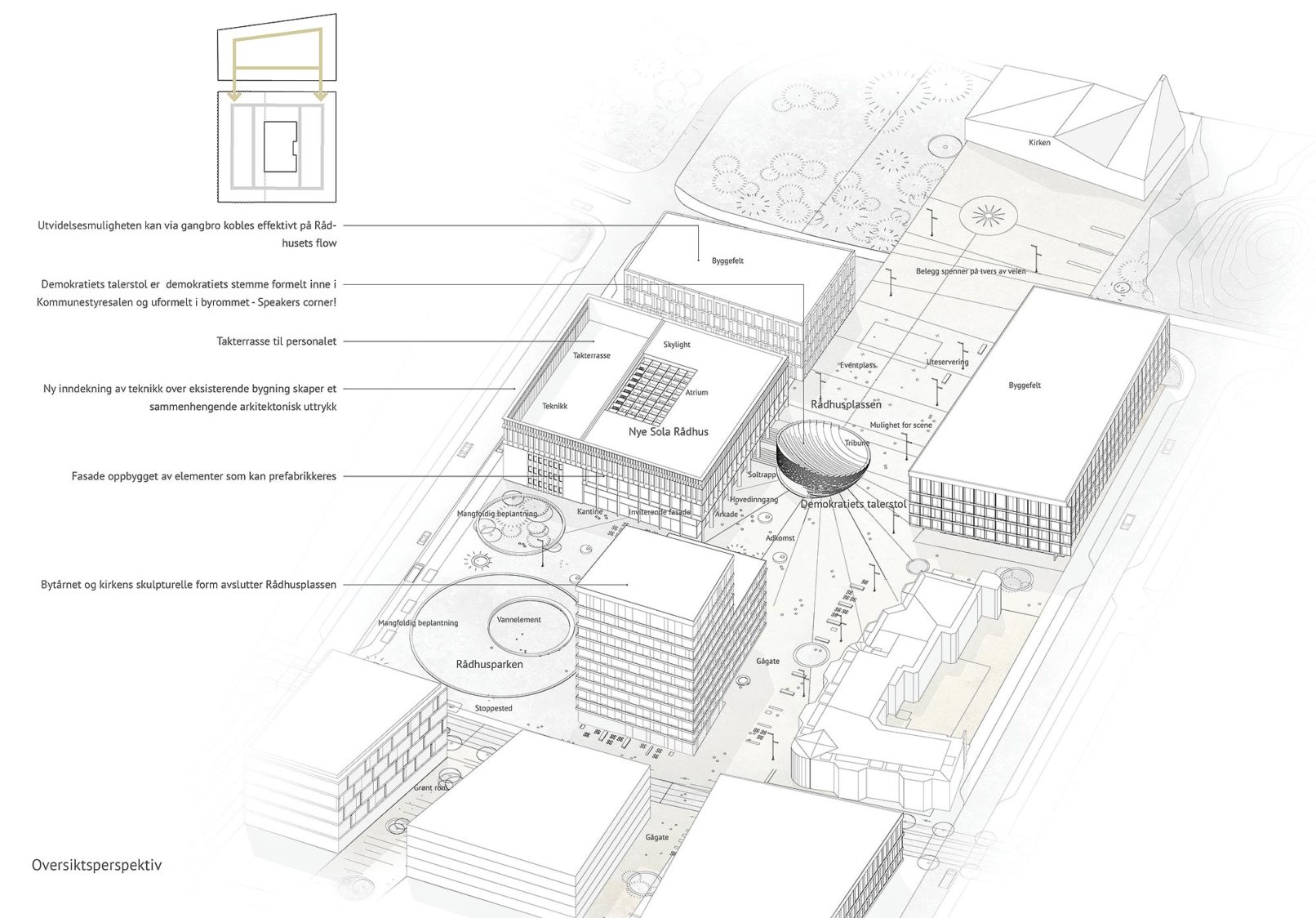 New Sola Town Hall is designed as the focal point in the transformation and development of the Sola city Center. The architectural vision is to unite the existing buildings with the new extension, expressing a renewed and open, democratic meeting place for residents.