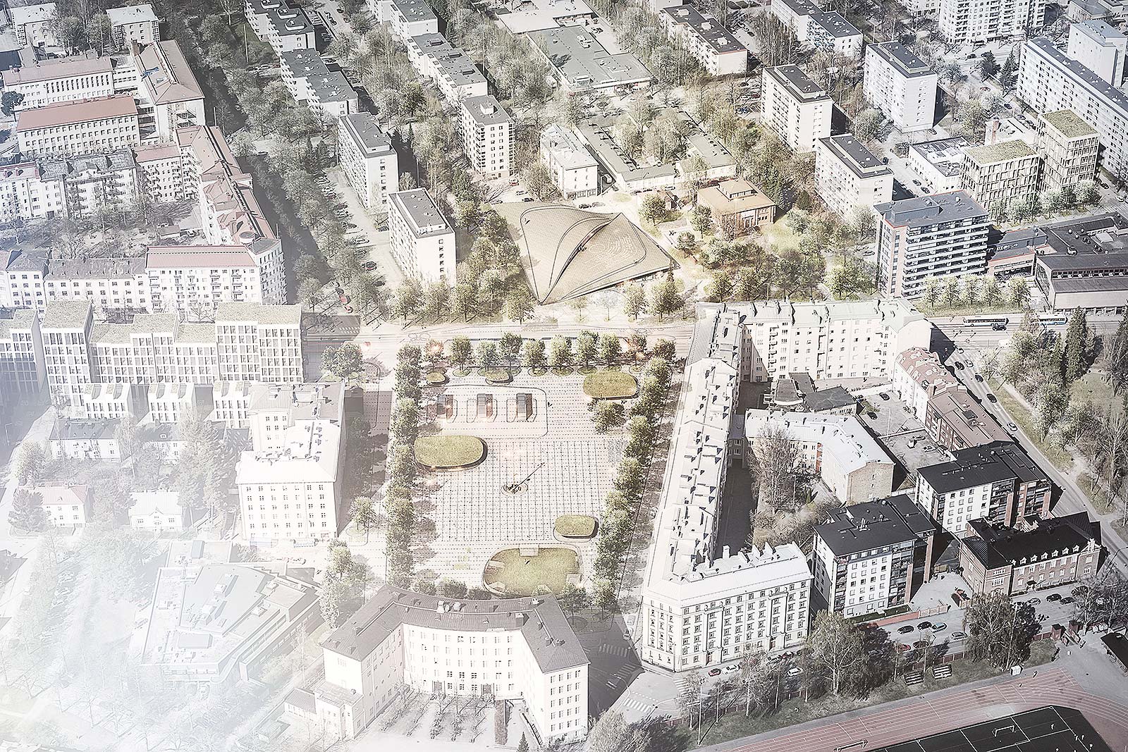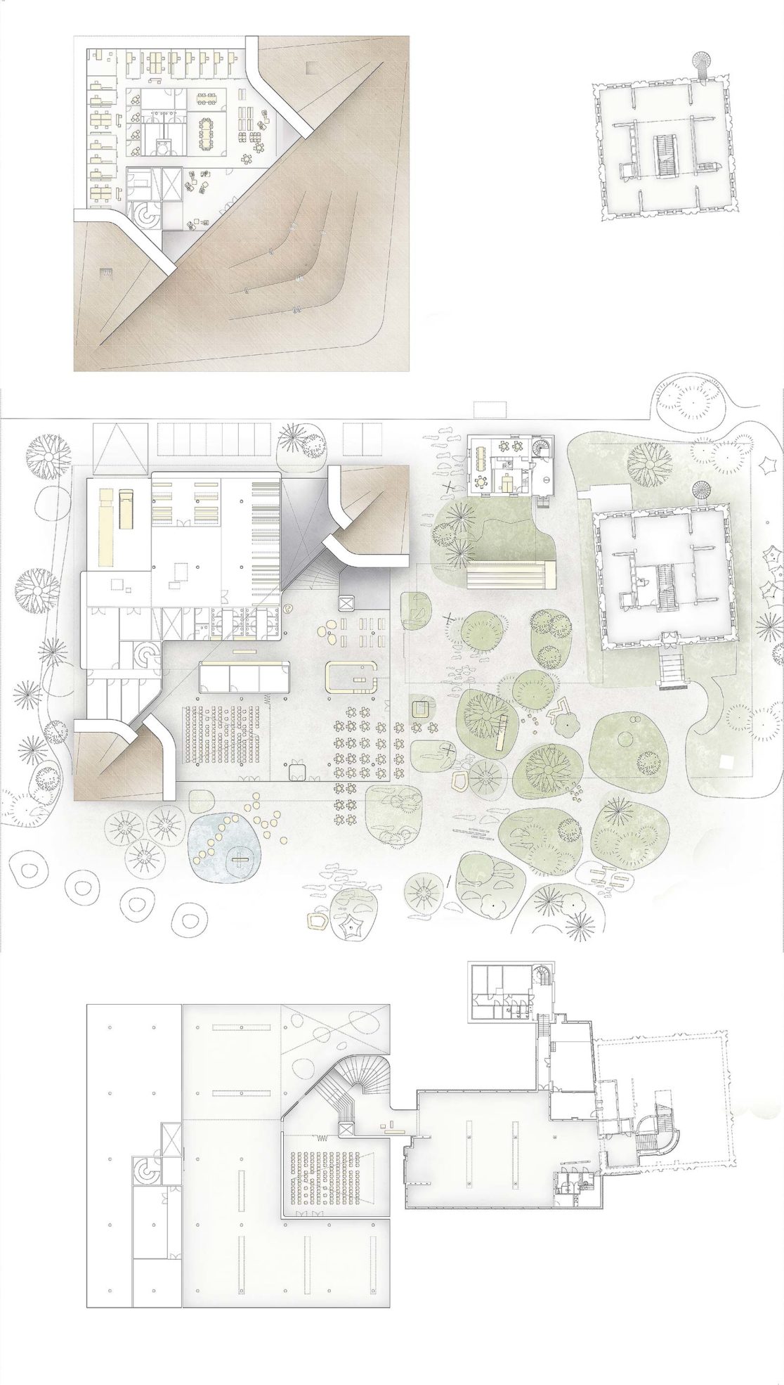 A playful use of the roof makes it a place to stay, relax, or party. Like a geologic outcrop, it rises from the site. It creates sectional variety as visitors move down through the levels, transitioning from a gently curved surface to a more rectilinear geometry. The roof’s warm wood material is inviting to touch while as a sculptural object, it acts as an icon and welcoming sign for the museum’s cultural events and programs.