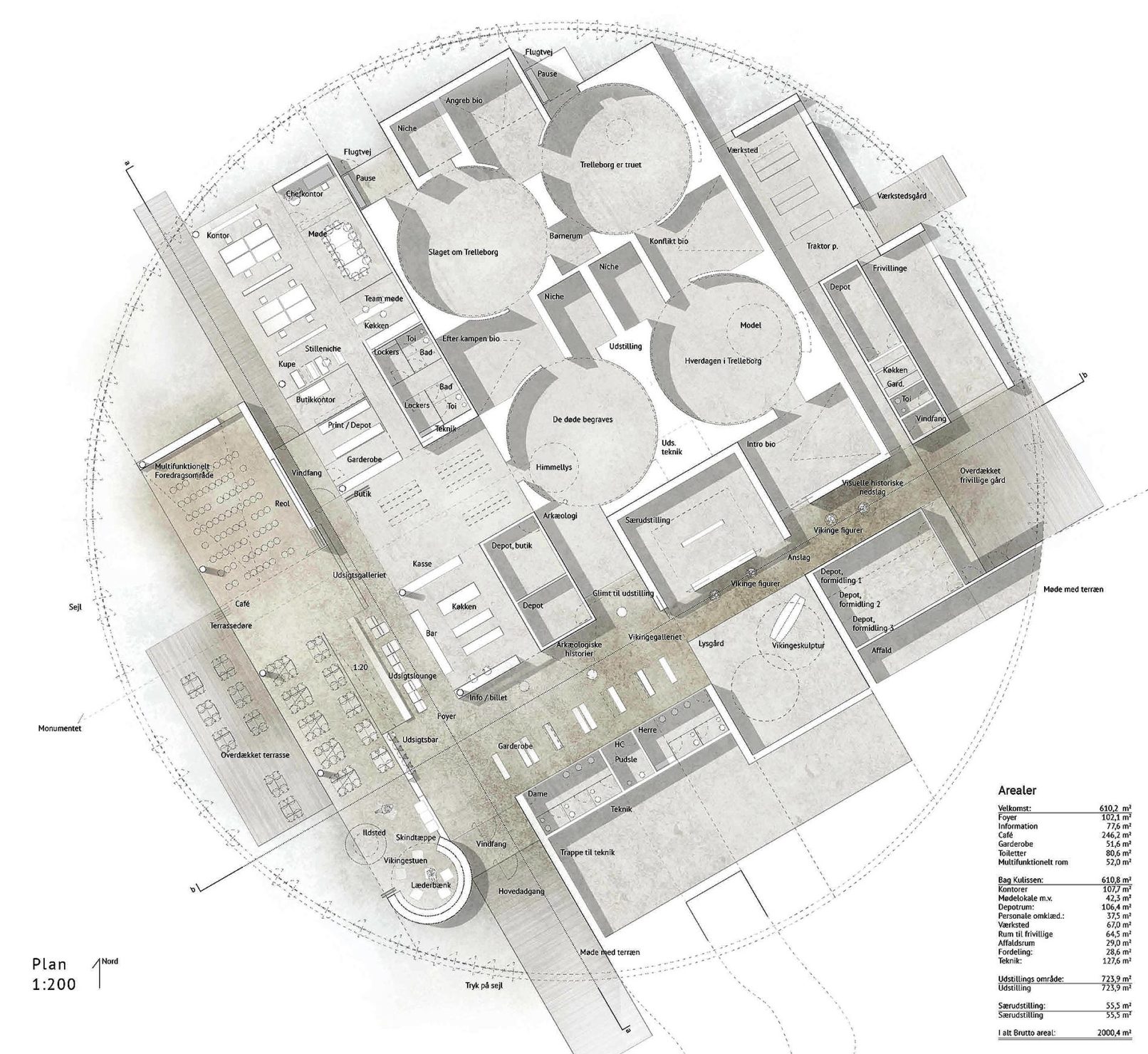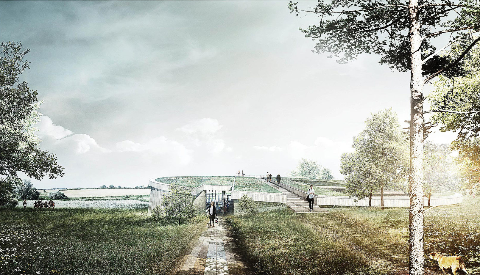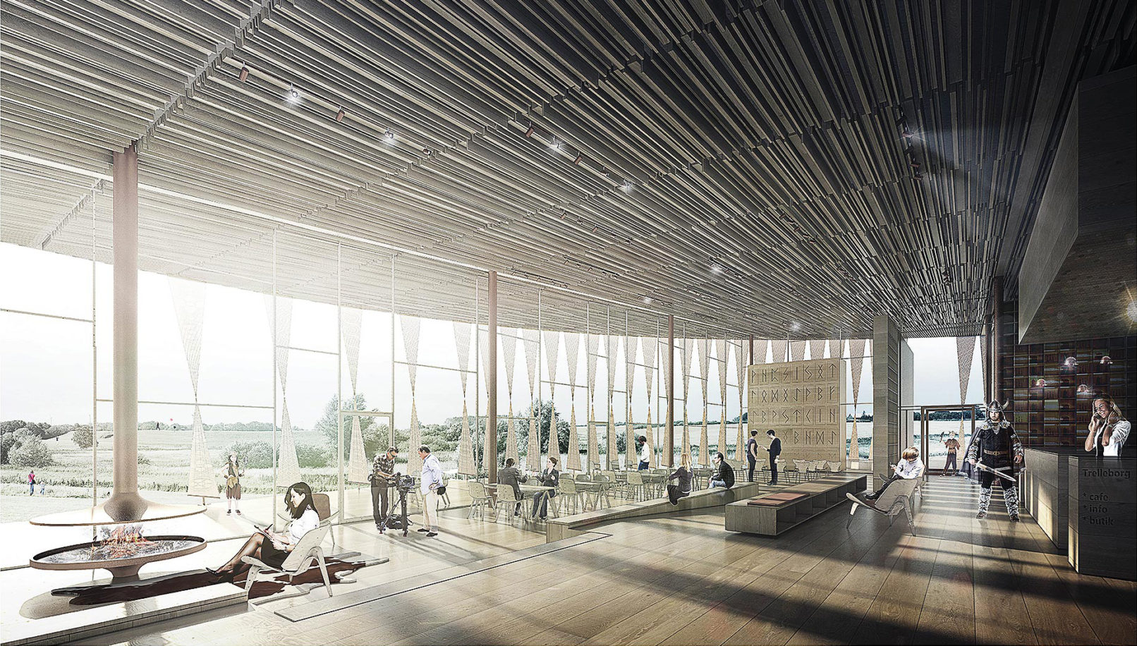 New Trelleborg is an experience and visitor’s center for the Viking fortress of Trelleborg. The circular motif of the fortress walls are echoed in the visitor’s center floor and roof organization. Like the Viking sod houses, the new building blends in with the surrounding landscape. Visitors may walk over the sod roof of the center to gain a view of the fortress or enter into a low hall which gives way to an expansive exhibition space.